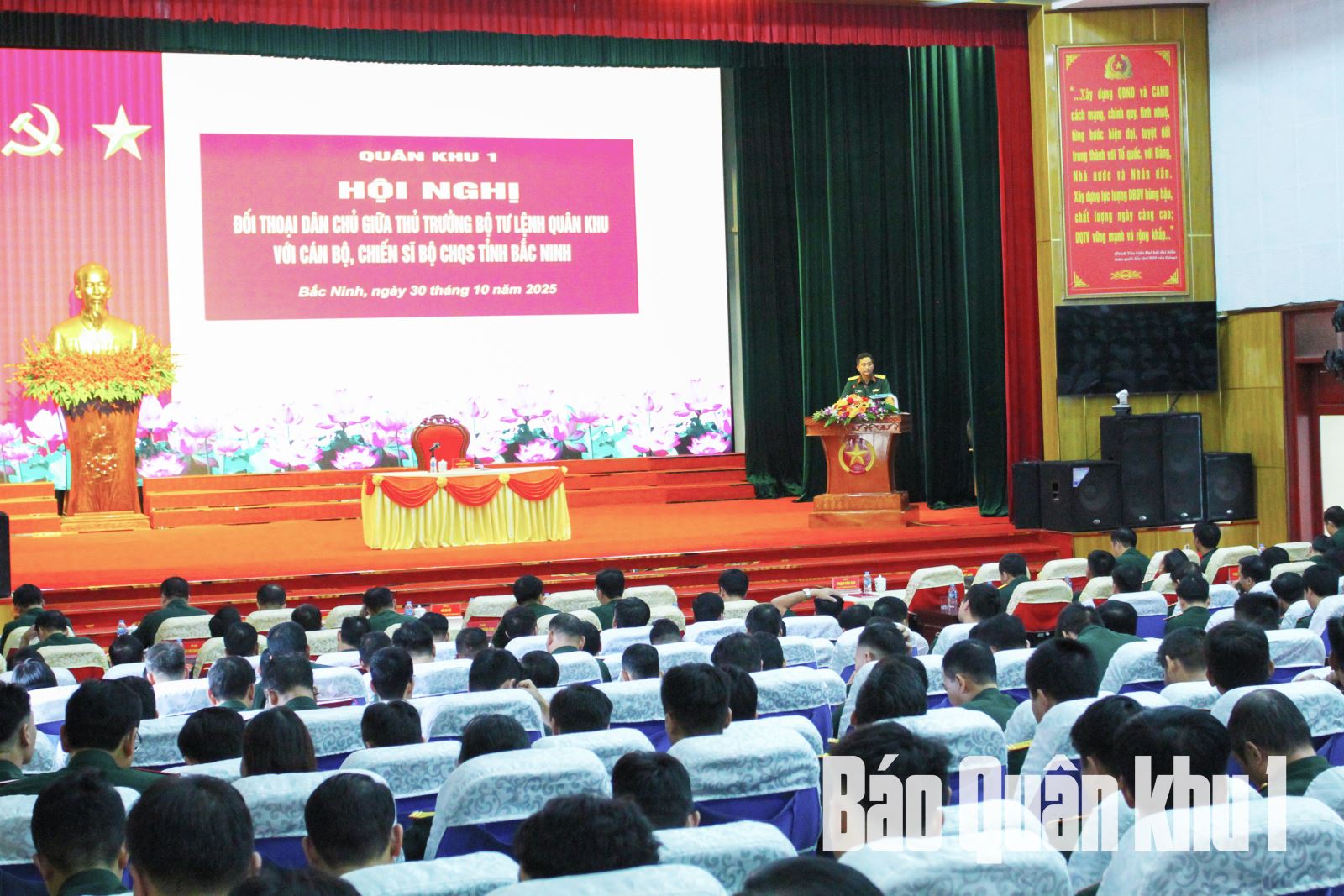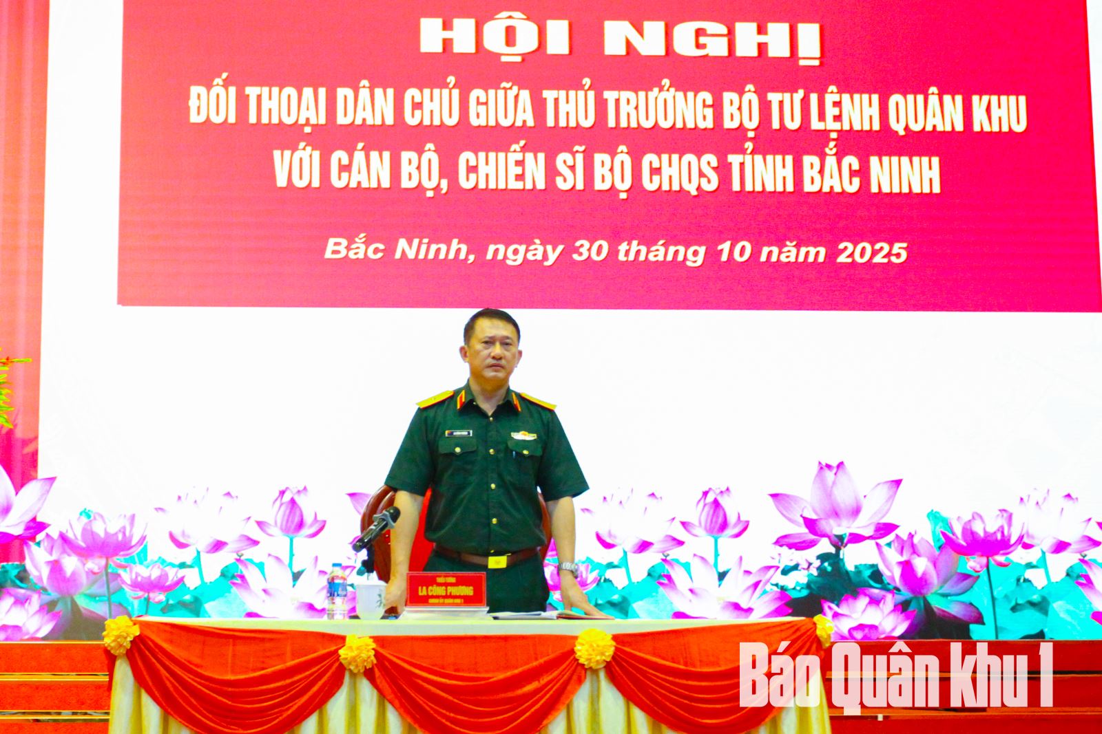 Chiều 30-10, Thiếu tướng La Công Phương, Bí thư Đảng ủy, Chính ủy Quân khu chủ trì Hội nghị đối thoại dân chủ với cán bộ, chiến sĩ Bộ CHQS tỉnh Bắc Ninh. Dự hội nghị có Đại tá Vũ Bá Bộ, Phó Chủ nhiệm Chính trị Quân khu; Đại tá Nguyễn Văn Hát, Phó Chủ nhiệm Hậu cần - Kỹ thuật Quân khu.