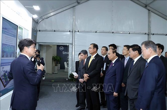 Thủ tướng Nguyễn Xuân Phúc cùng Tổng thống Hàn Quốc và các đại biểu xem triển lãm tại Lễ động thổ xây dựng thành phố thông minh Eco-Delta.