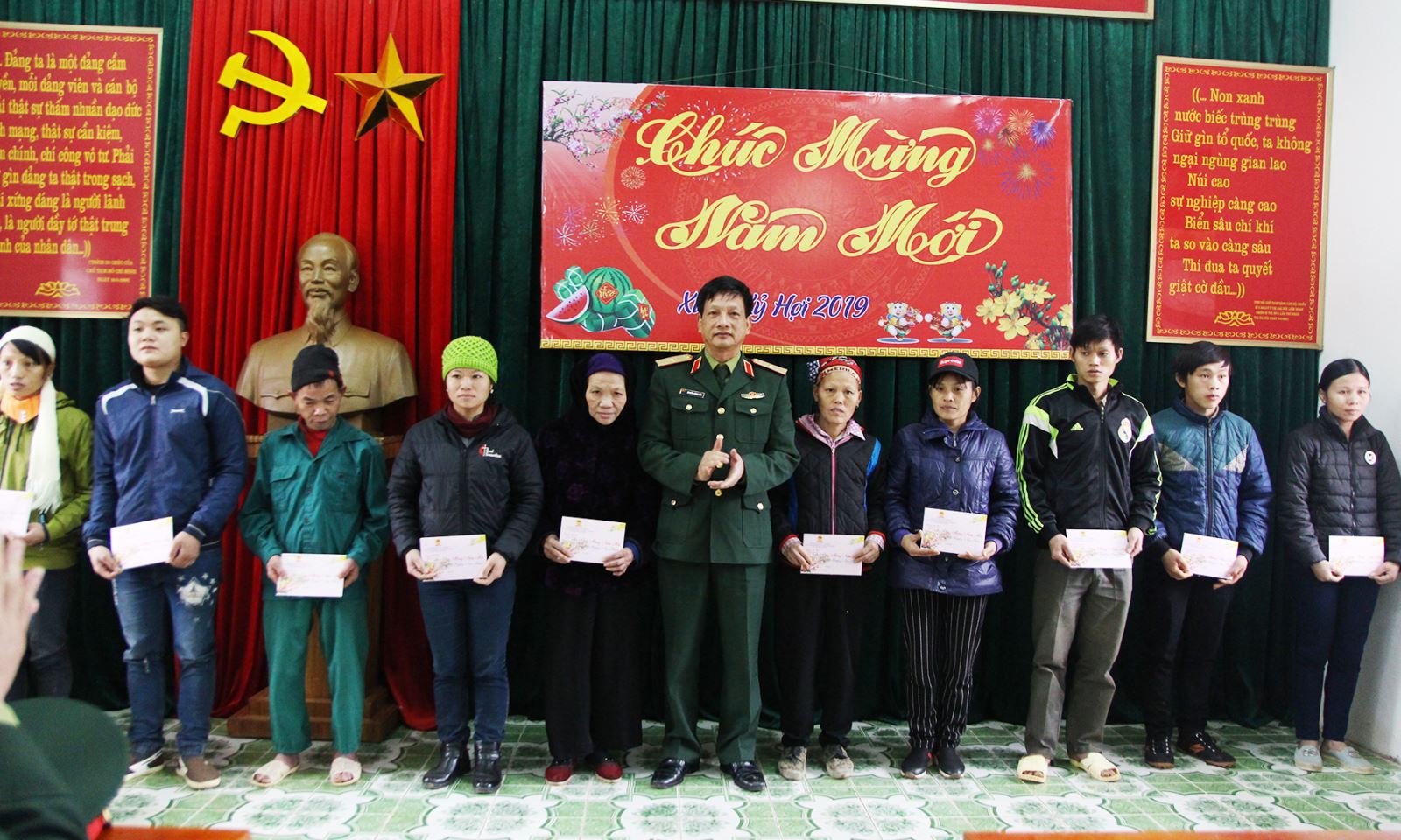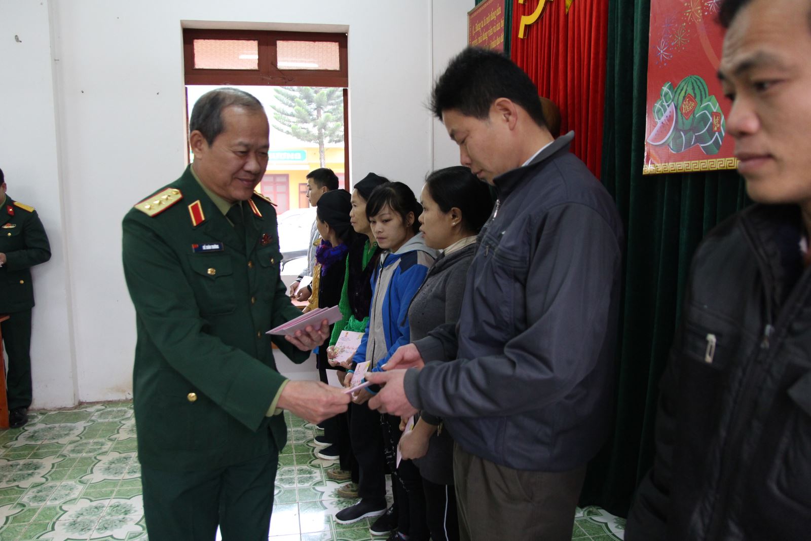 Thiếu tướng Nguyễn Đăng Bảo, Phó tham mưu trưởng Quân khu, thành viên đoàn công tác trao quà của Bộ Quốc phòng tặng các hộ nghèo khu vực biên giới.