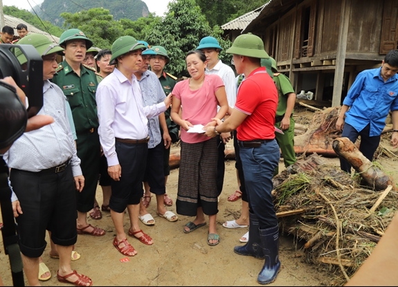 Đoàn công tác thăm hỏi gia đình có người chết và nhà bị sập, trôi hoàn toàn tại bản Sa Ná, xã Na Mèo, huyện Quan Sơn, Thanh Hoá.