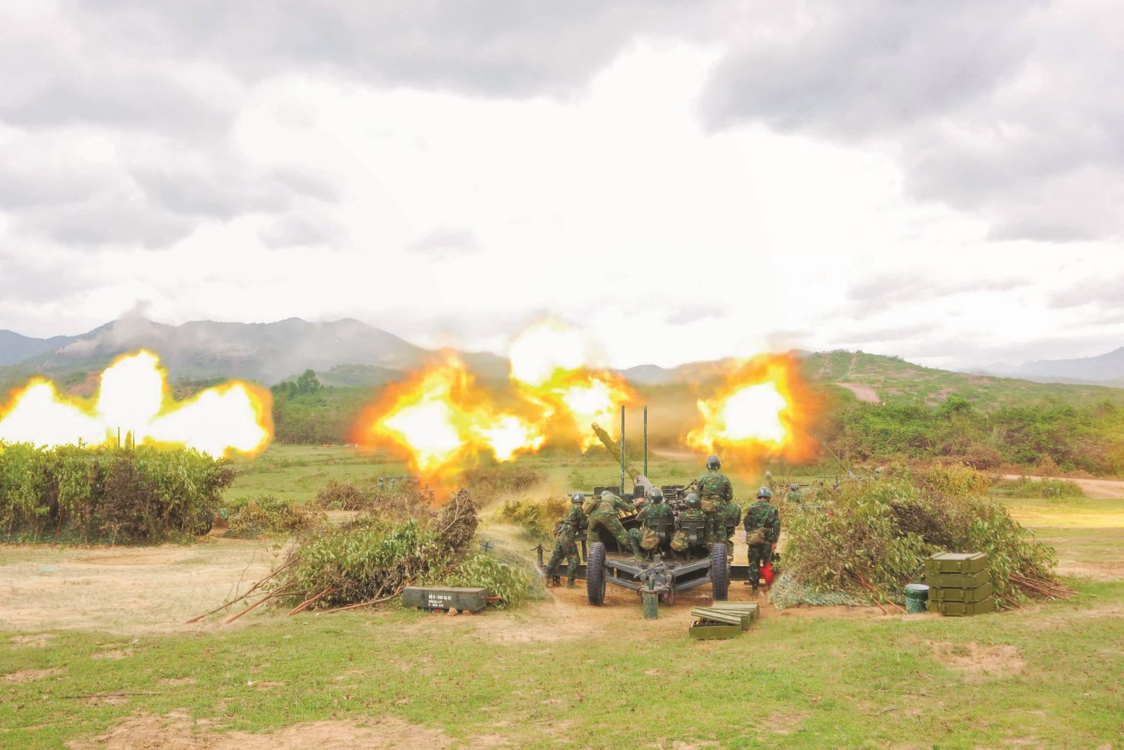 Trận địa pháo Đại đội 1, Tiểu đoàn 3 bắn đạn thật trong diễn tập hiệp đồng quân binh chủng. Ảnh: TH