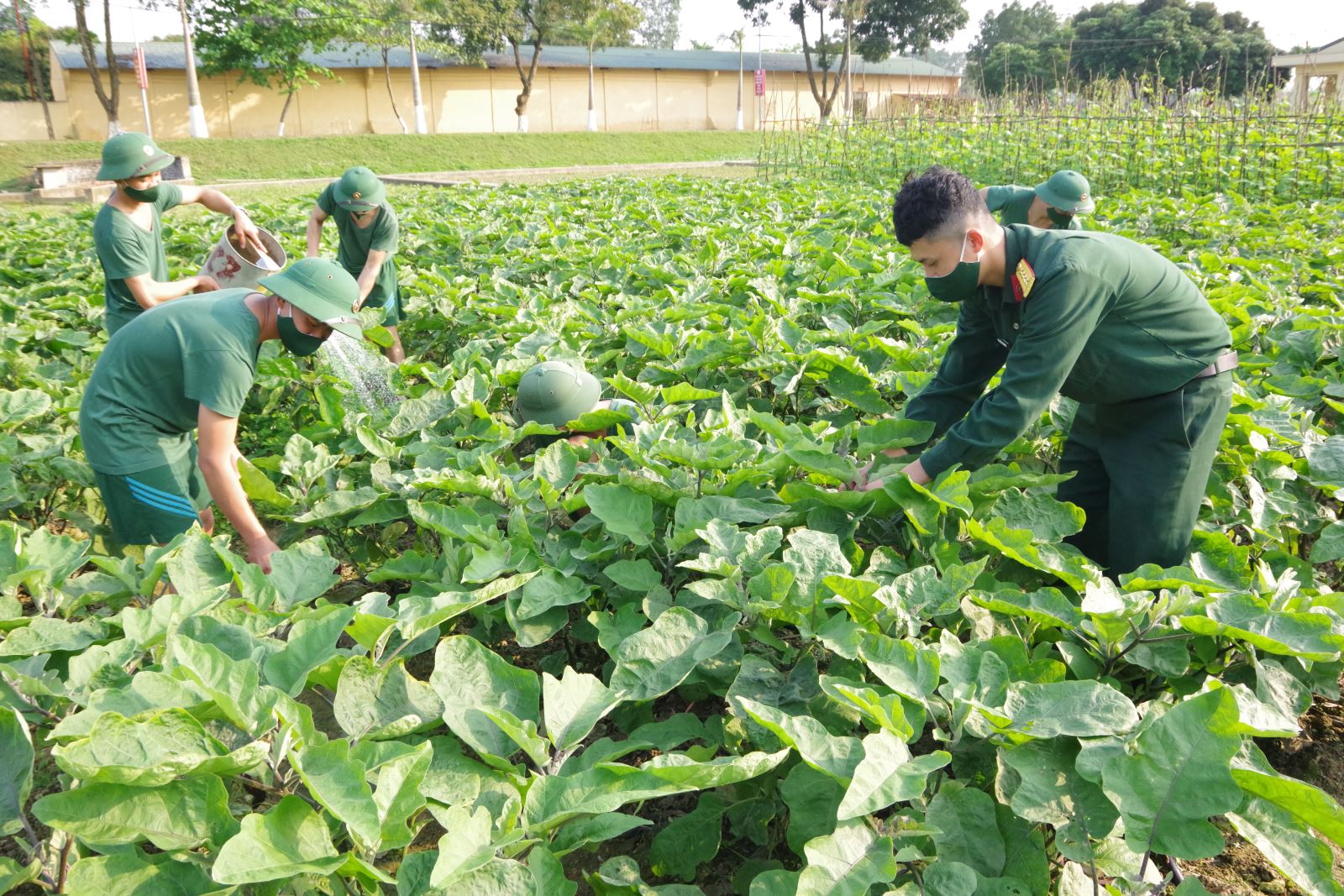 Cán bộ, chiến sĩ Tiểu đoàn 3, Lữ đoàn Thông tin 601 chăm sóc rau xanh.