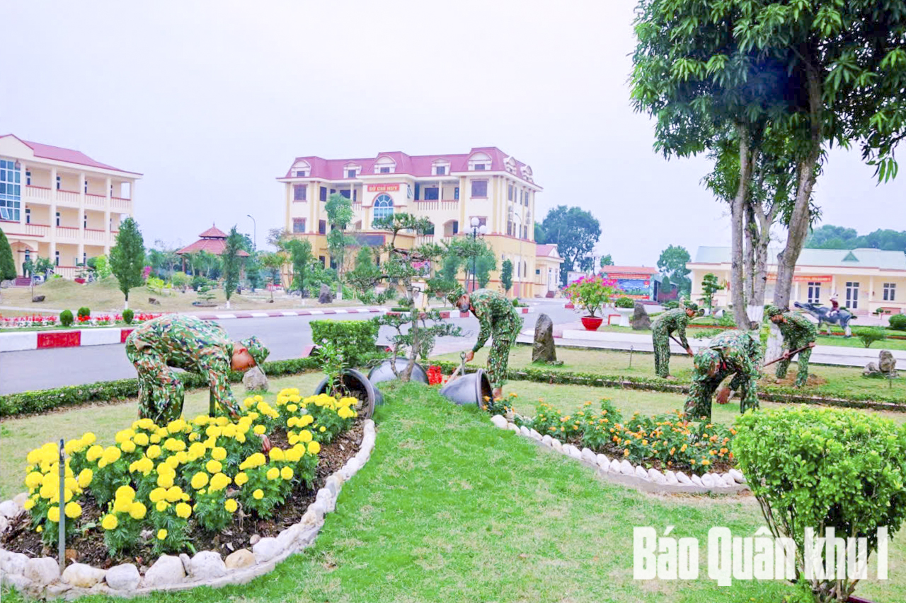 Cán bộ, chiến sĩ Lữ đoàn Pháo binh 382 tích cực củng cố cảnh quan doanh trại “chính quy, sáng, xanh, sạch đẹp”. Ảnh: PV