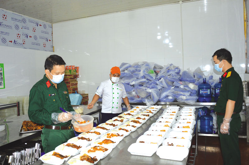 Đại úy Tô Văn Thăng (bên trái) chuẩn bị suất ăn cho công dân cách ly.