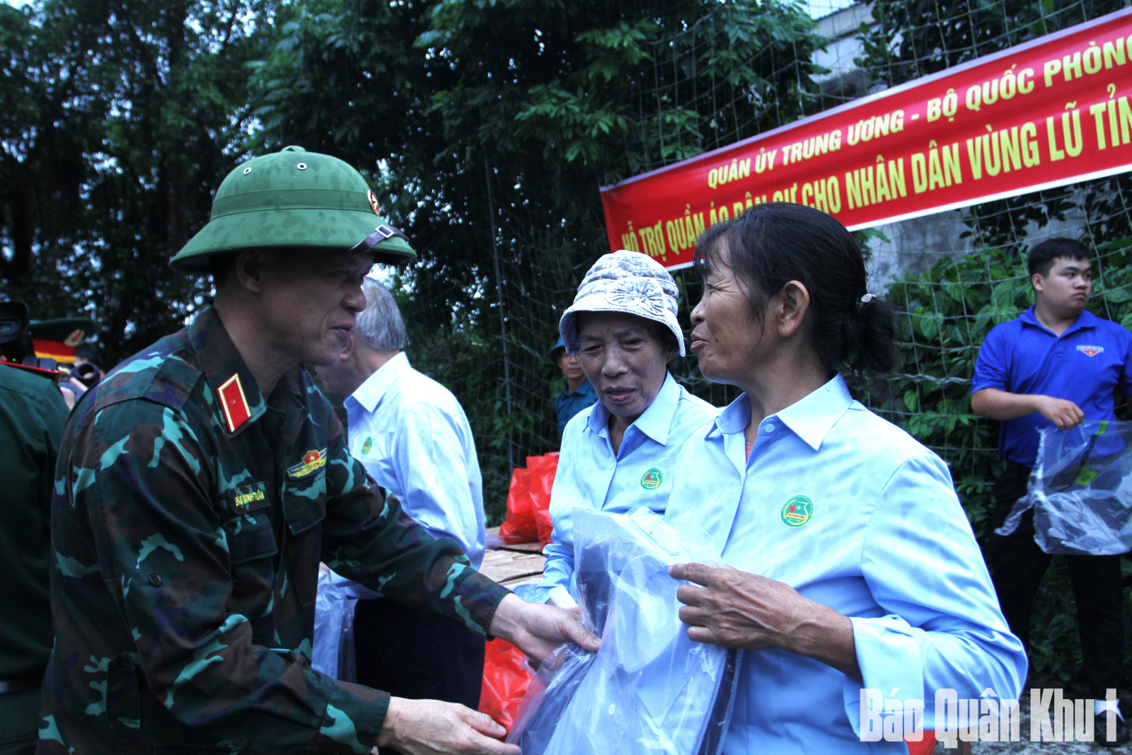 Đoàn công tác Quân khu 1 trao quần áo hỗ trợ nhân dân bị ảnh hưởng bởi bão, lũ.