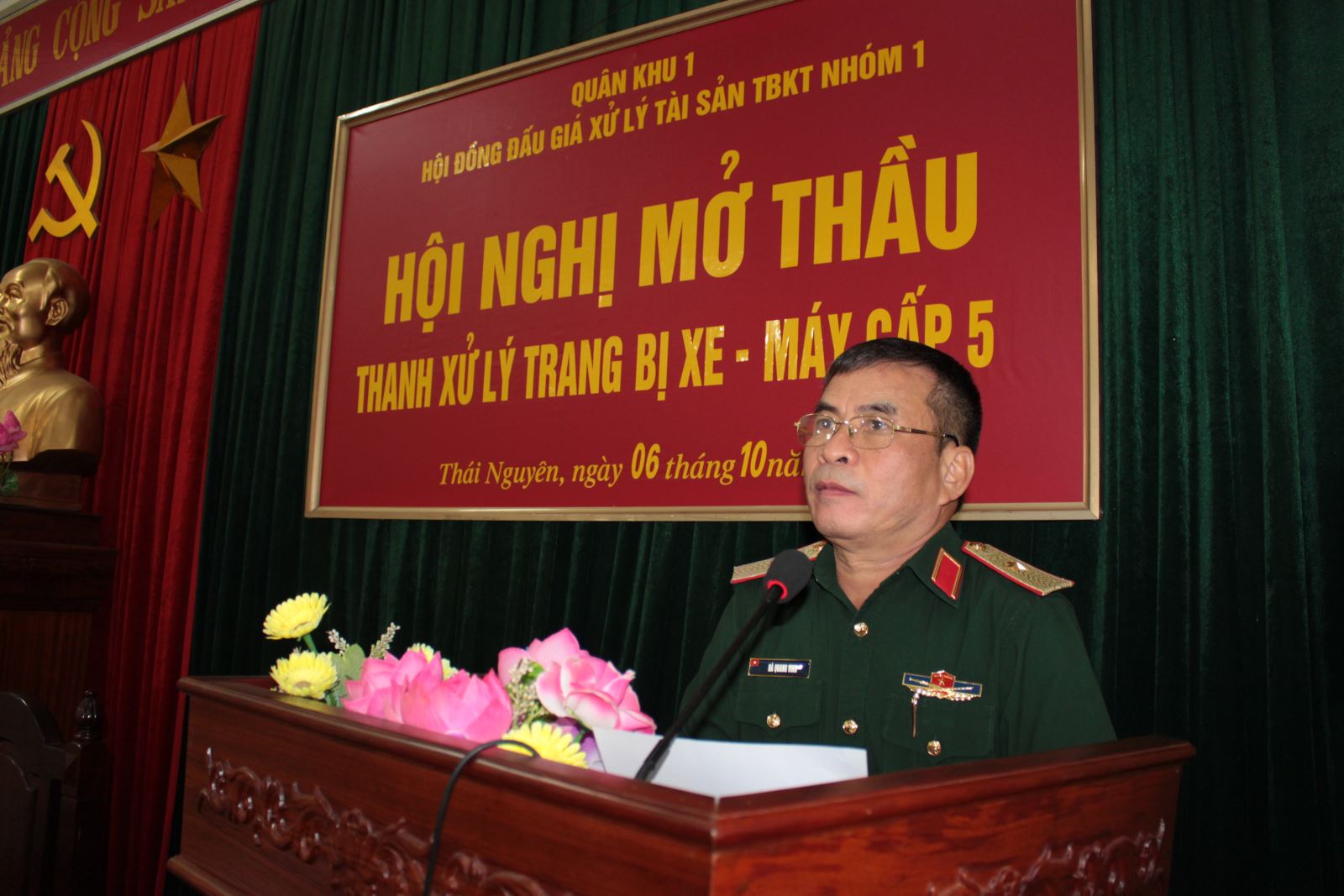 Thiếu tướng Hà Quang Vinh, Phó Tham mưu trưởng Quân khu, Phó chủ tịch thường trực Hội đồng đấu giá xử lý tài sản trang bị kỹ thuật nhóm 1 của Quân khu phát biểu tại hội nghị.