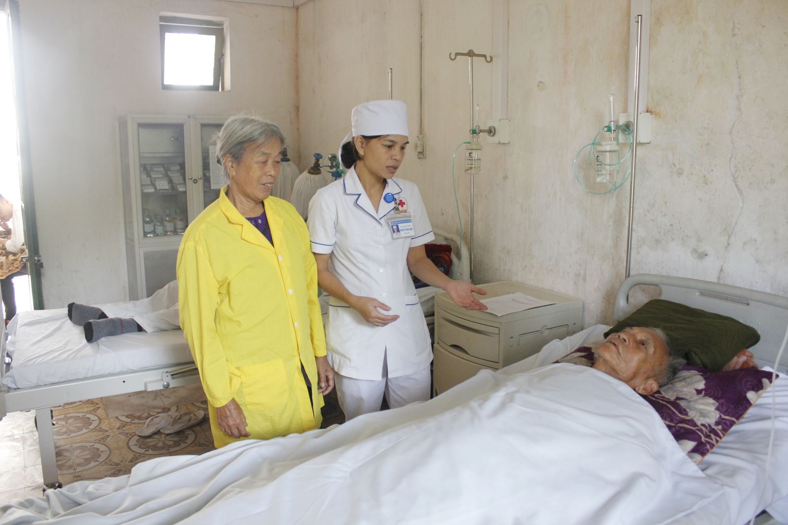 Điều dưỡng trưởng Nguyễn Thị Mai Dung hướng dẫn người nhà cách chăm sóc bệnh nhân.