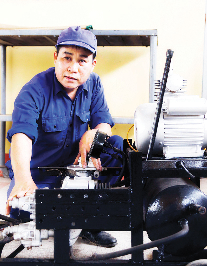 Vốn tính siêng năng, cùng niềm đam mê công tác kỹ thuật, Nguyễn Văn Cường không ngừng học hỏi kinh nghiệm những người đi trước, từng bước nắm chắc nhiệm vụ. Khi công việc thành thạo, được giao những nội dung khó, phức tạp, cũng là lúc anh bắt đầu trăn trở phải làm sao để đẩy nhanh tiến độ công việc mà vẫn bảo đảm yêu cầu đề ra, trong khi thực trạng nhiều loại trang bị do sử dụng lâu năm, đã xuống cấp nghiêm trọng. Từ những suy nghĩ đó, anh tích cực tìm tòi, nghiên cứu, cho ra đời nhiều sáng kiến cải tiến có tính khả thi cao. Sản phẩm đầu tiên phải kể đến là “Thiết bị kiểm thử tổng phanh hơi sau sửa chữa”. Trước kia, việc sửa chữa, bảo dưỡng hệ thống tổng phanh hơi xe ô tô đòi hỏi phải thợ tay nghề cao, từ thợ bậc 6/7 mới được thực hiện. Một phần bởi độ khó của công việc; phần khác là do ở các đơn vị vận tải, cơ bản được biên chế loại xe zin 130, 131. Hệ thống tổng phanh của các loại xe này có đặc điểm thiết kế sát với phần “sắt-xi” và ống xả nên khi thao tác sửa chữa thợ bị bỏng tay thường xuyên. Đòi hỏi của công việc cao như vậy, trong khi đội ngũ thợ lành nghề bậc cao ở đơn vị lại không có nhiều, hệ thống xe biên chế trong đơn vị qua nhiều năm sử dụng đã xuống cấp, hay hỏng hóc, nhất là hệ thống phanh bảo đảm an toàn khi cơ động thực hiện nhiệm vụ. Không lẽ thợ ở đơn vị có, mà xe lại cứ phải mang đi xưởng lớn sửa chữa. Sau nhiều đêm trằn trọc suy nghĩ, mang ý tưởng của mình báo cáo cấp trên, trao đổi cùng anh em trong đơn vị rồi bắt tay vào thực hiện. Từ những chiếc xe cấp 5 trả kho, anh cùng đồng nghiệp đề nghị xin lại một số chi tiết còn dùng được; thiết kế thêm phần bơm hơi và khung giá cố định mô phỏng hệ thống trên xe để thực hành sửa chữa.