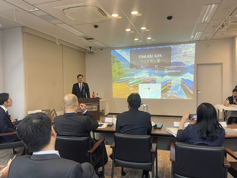 Lãnh đạo tỉnh Bắc Kạn giới thiệu về tỉnh tại Hội nghị giao thương hợp tác, đầu tư, thương mại Việt Nam-Nhật Bản tổ chức tại Tokyo (Nhật Bản). (Ảnh: PHƯƠNG THẢO)