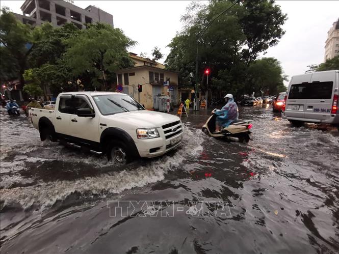 Mưa lớn gây ngập tại ngã tư Phan Bội Châu - Lý Thường Kiệt (Hoàn Kiếm, Hà Nội), chiều 20/8. Ảnh: Thành Đạt/TTXVN