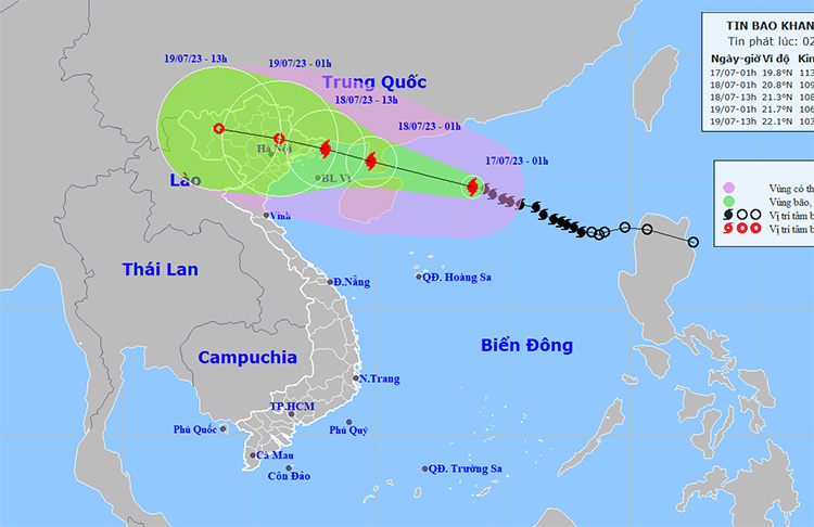 Theo Trung tâm Dự báo Khí tượng Thủy văn Quốc gia, 4 giờ ngày 17/7, vị trí tâm bão ở vào khoảng 20 độ Vĩ Bắc; 113,5 độ Kinh Đông, cách bán đảo Lôi Châu (Trung Quốc) khoảng 340km về phía Đông Đông Nam. Sức gió mạnh nhất vùng gần tâm bão mạnh cấp 11-12 (103-133km/giờ), giật cấp 15.