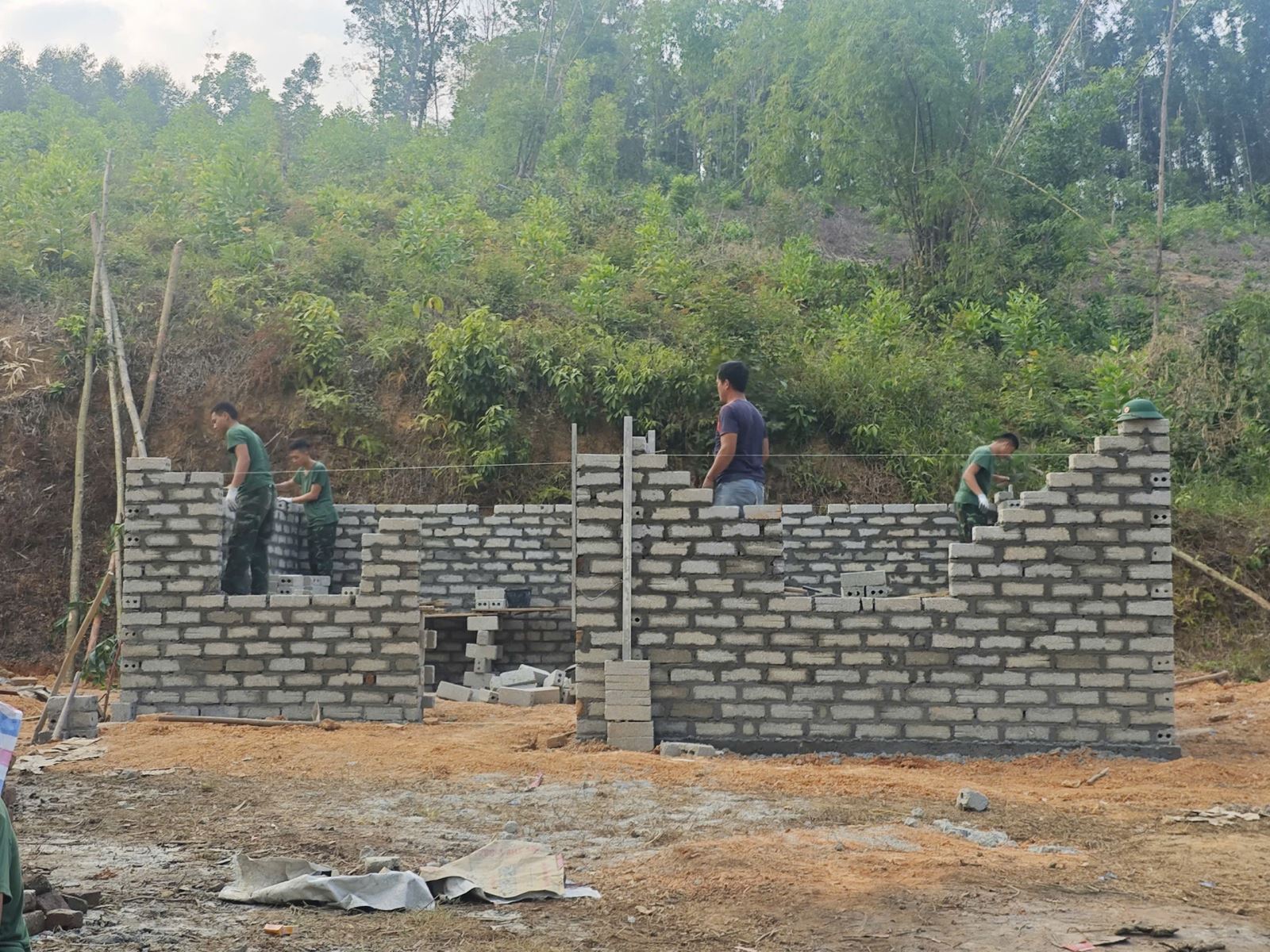 Cán bộ, chiến sĩ Tiểu đoàn 16, Sư đoàn 3 giúp gia đình ông Lý Văn Thơ xây dựng nhà.