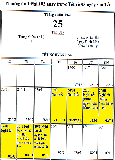 Phương án 1: Nghỉ hai ngày cuối năm Kỷ Hợi và ba ngày đầu năm Canh Tý. Công chức, viên chức nghỉ tết âm lịch từ thứ năm (23/1/2020) đến hết thứ Tư (29/1/2020). Tức từ ngày 29 tháng Chạp năm Kỷ Hợi đến hết mùng 5 tháng Giêng năm Canh Tý.