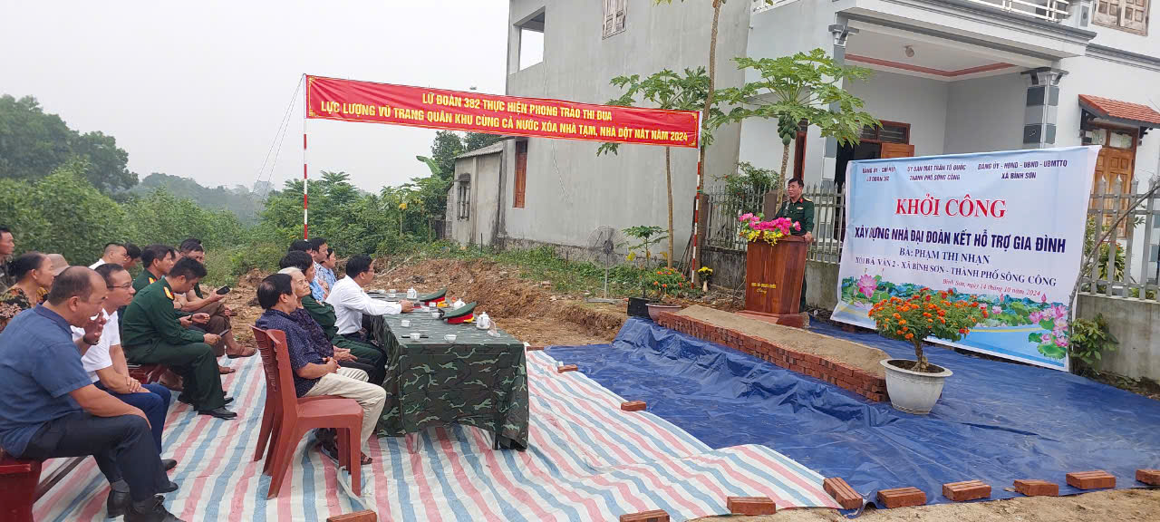 Ngày 14-10, Lữ đoàn Pháo binh 382 phối hợp với cấp ủy, chính quyền và nhân dân xã Bình Sơn, TP Sông Công, tỉnh Thái Nguyên tổ chức khởi công xây dựng “Nhà đại đoàn kết” tặng hộ gia đình bà Phạm Thị Nhạn, ở xóm Bá Vân 2, xã Bình Sơn.