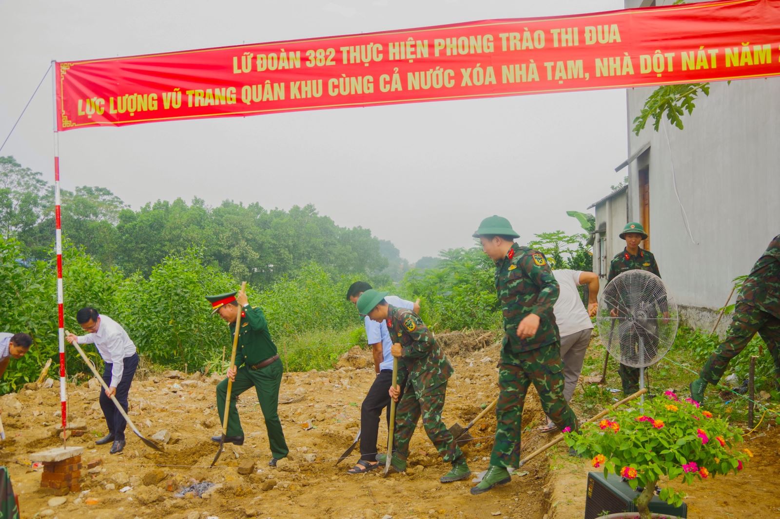 Cán bộ, chiến sĩ Lữ đoàn 382 cùng chính quyền địa phương tham gia khởi công xây “Nhà đại đoàn kết”.