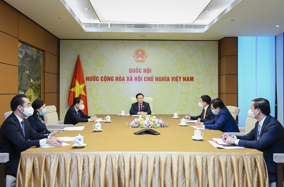 Chủ tịch Quốc hội và đoàn đại biểu Việt Nam tham dự điện đàm.
