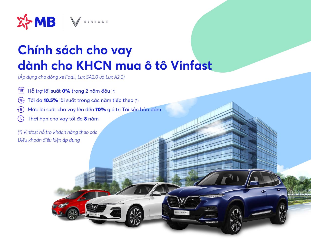 Với chính sách ưu đãi hấp dẫn, thủ tục vay vốn nhanh chóng, đơn giản cùng đội ngũ cán bộ nhân viên chuyên nghiệp, khách hàng của MB sẽ dễ dàng sở hữu chiếc xe đô thị đa dụng Fadil cũng như 2 dòng xe đẳng cấp Châu Âu Lux A2.0 và Lux SA2.0.