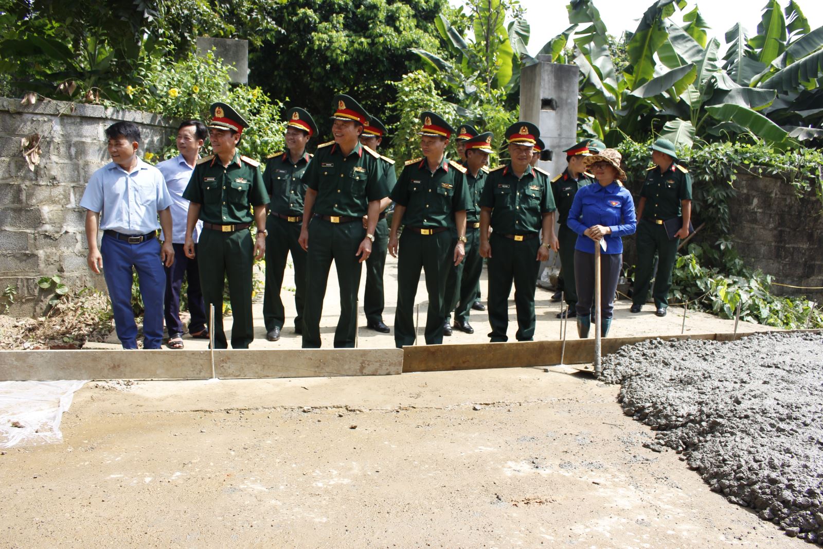 Thiếu tướng Nguyễn Đình Chiêu kiểm tra tiến độ thi công đường bê tông nông thôn tại xóm Phúc Thành.