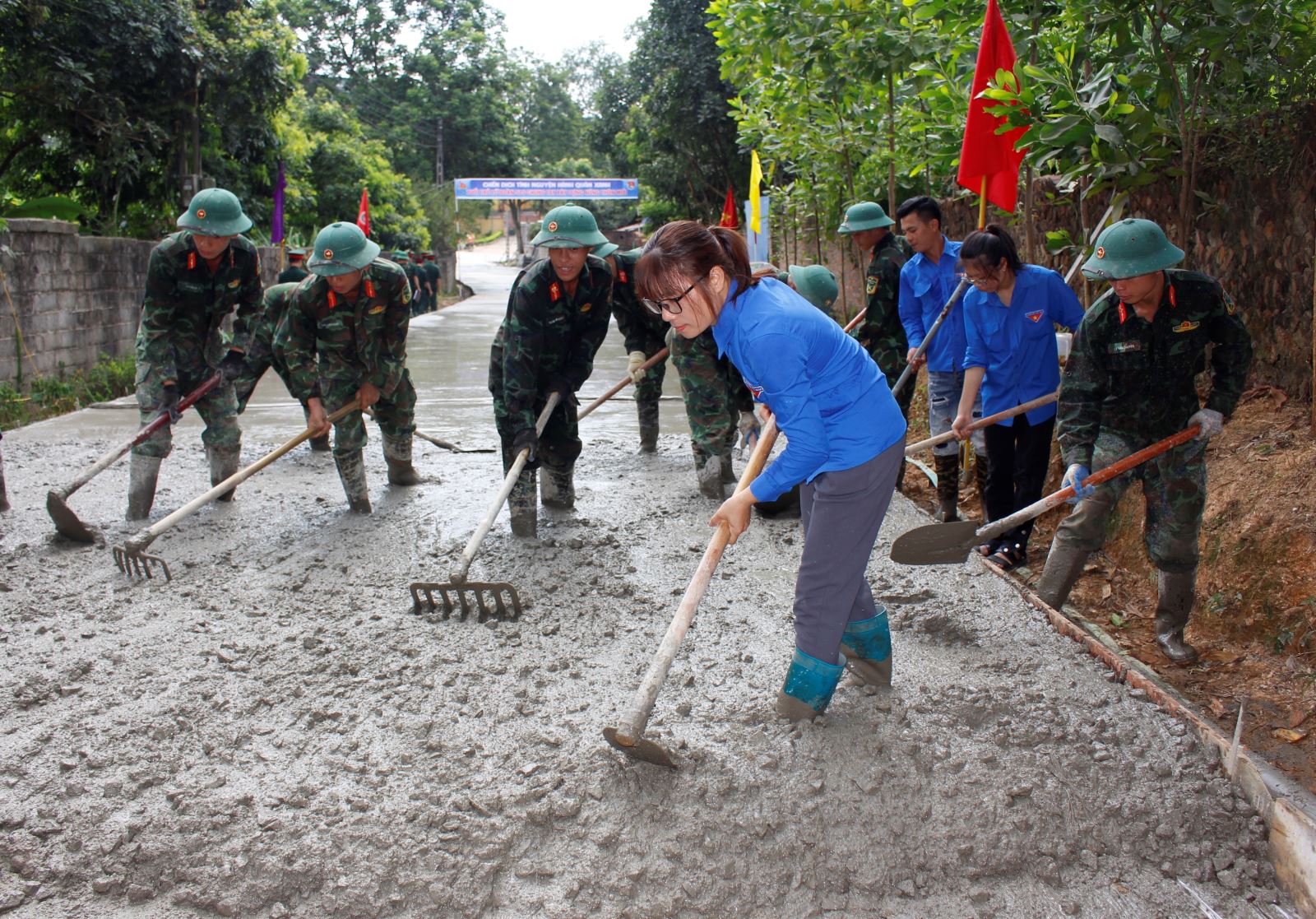 Chiến sĩ Lữ đoàn Công binh 575 và đoàn viên thanh niên xóm Phúc Thành tham gia làm đường bê tông nông thôn.