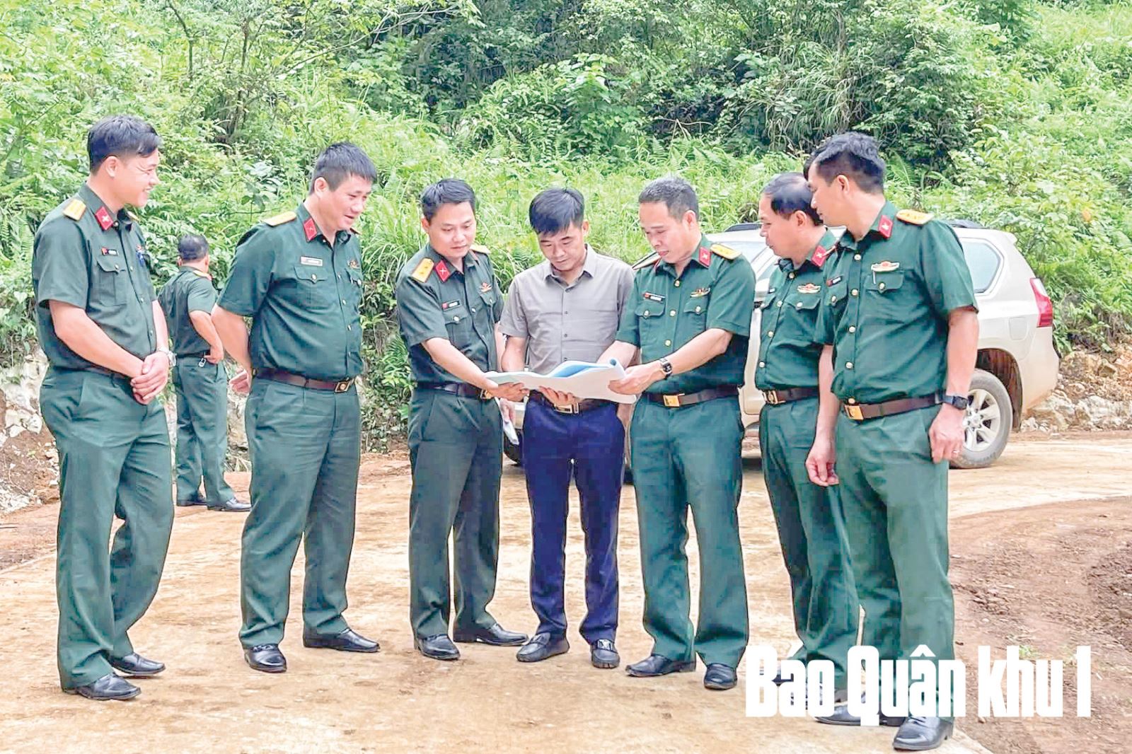 Chỉ huy Đoàn Kinh tế-Quốc phòng 799 kiểm tra tiến độ thi công Công trình đường giao thông Tà Cáp-Nà Ca. Ảnh: HỨA HÙNG