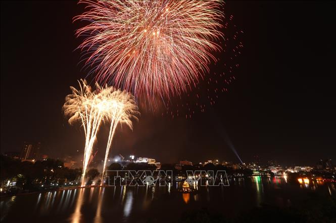 Pháo hoa mừng năm mới tại khu vực Hồ Hoàn Kiếm. Ảnh: Minh Quyết/TTXVN