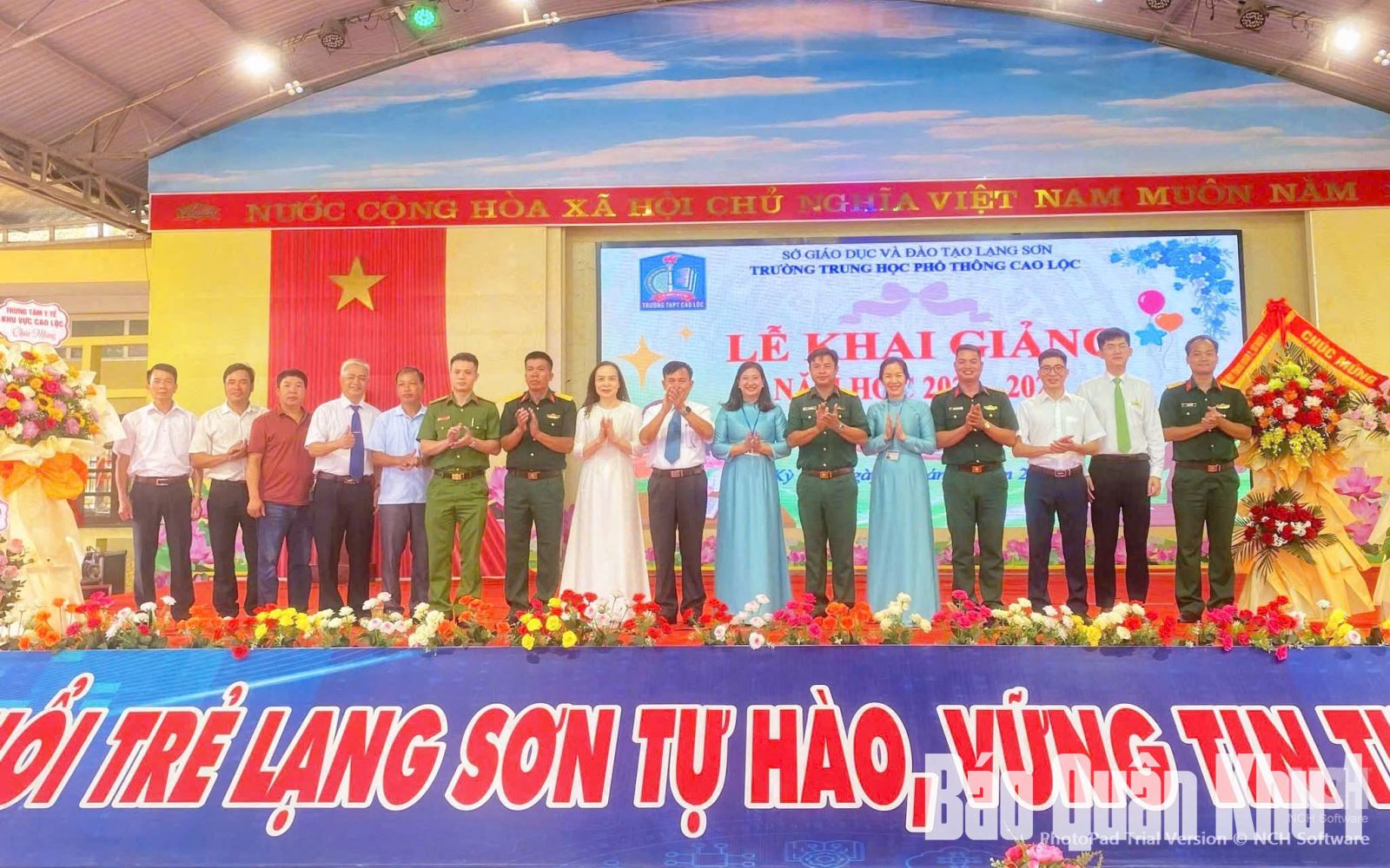 Cán bộ Trung đoàn 2 (Sư đoàn 3) cùng đại diện cấp ủy, chính quyền địa phương chúc mừng Ban Giám hiệu Trưởng THPT Cao Lộc.