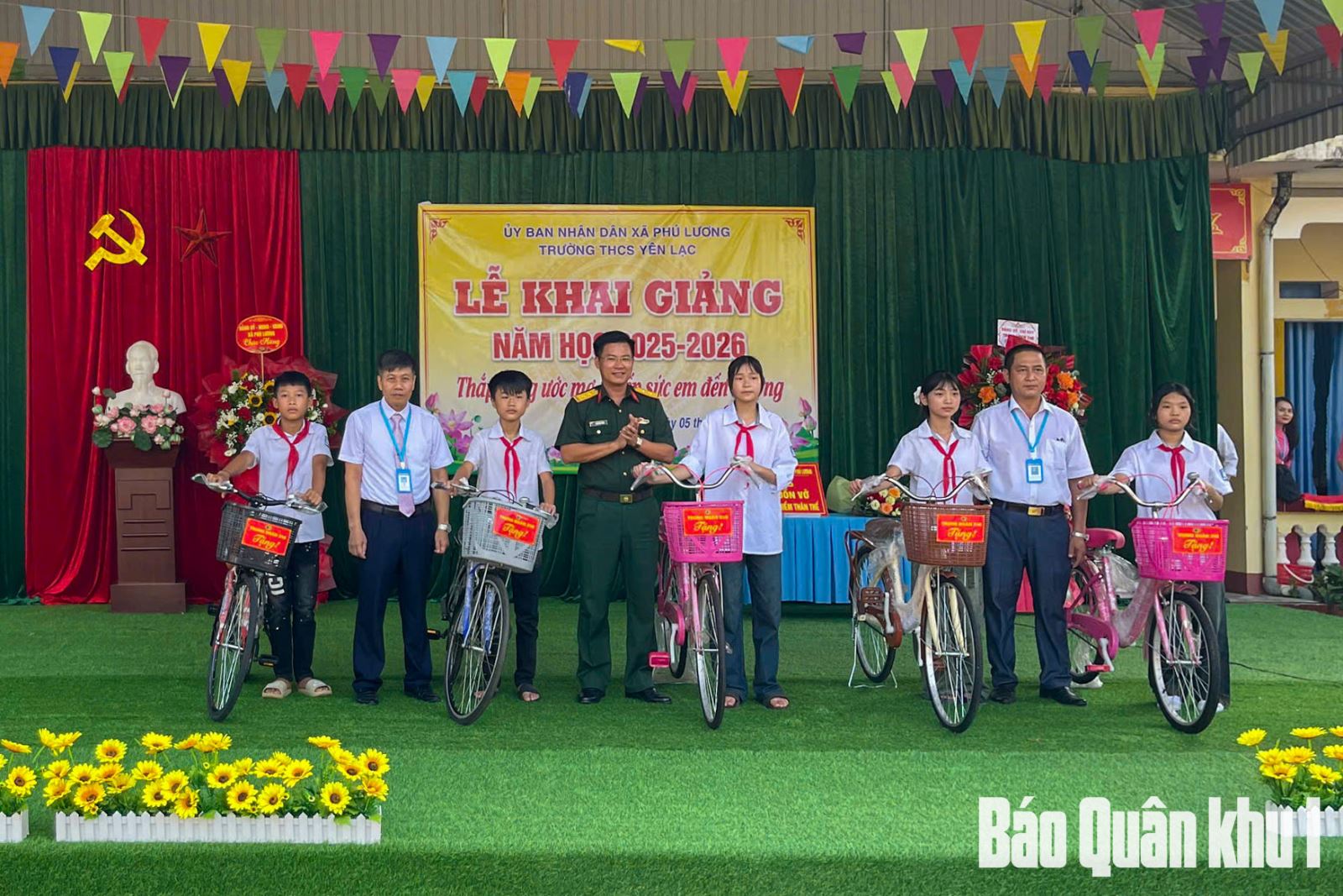 Trung tá Trần Văn Tuyên, Phó Chính ủy Trung đoàn 246 tặng xe đạp cho học sinh có hoàn cảnh khó khăn.