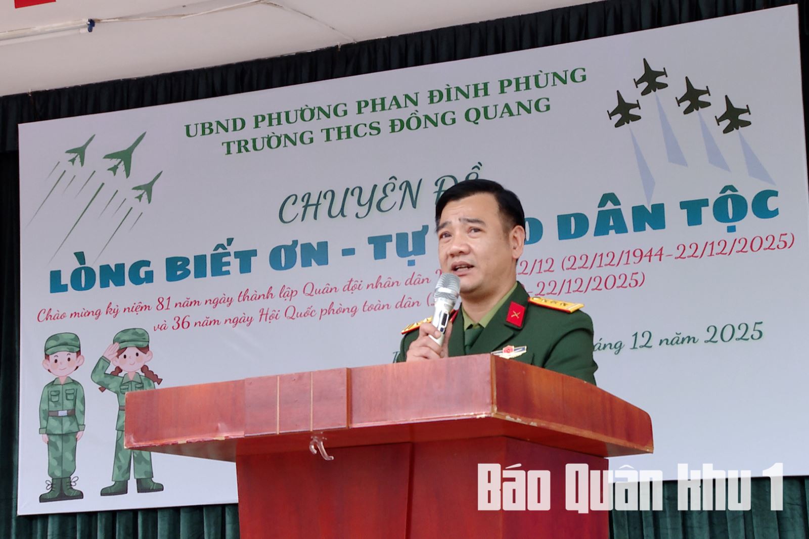 Chiều 19-12, nhân kỷ niệm 81 năm Ngày thành lập Quân đội nhân dân Việt Nam (22/12/1944 – 22/12/2025) và 36 năm Ngày hội Quốc phòng toàn dân (22/12/1989 – 22/12/2025), Cục Chính trị phối hợp với Trường Trung học cơ sở Đồng Quang (phường Phan Đình Phùng, Thái Nguyên) tổ chức tuyên truyền, giáo dục truyền thống vẻ vang của dân tộc và Quân đội nhân dân Việt Nam với chủ đề “Lòng biết ơn – Tự hào dân tộc”.