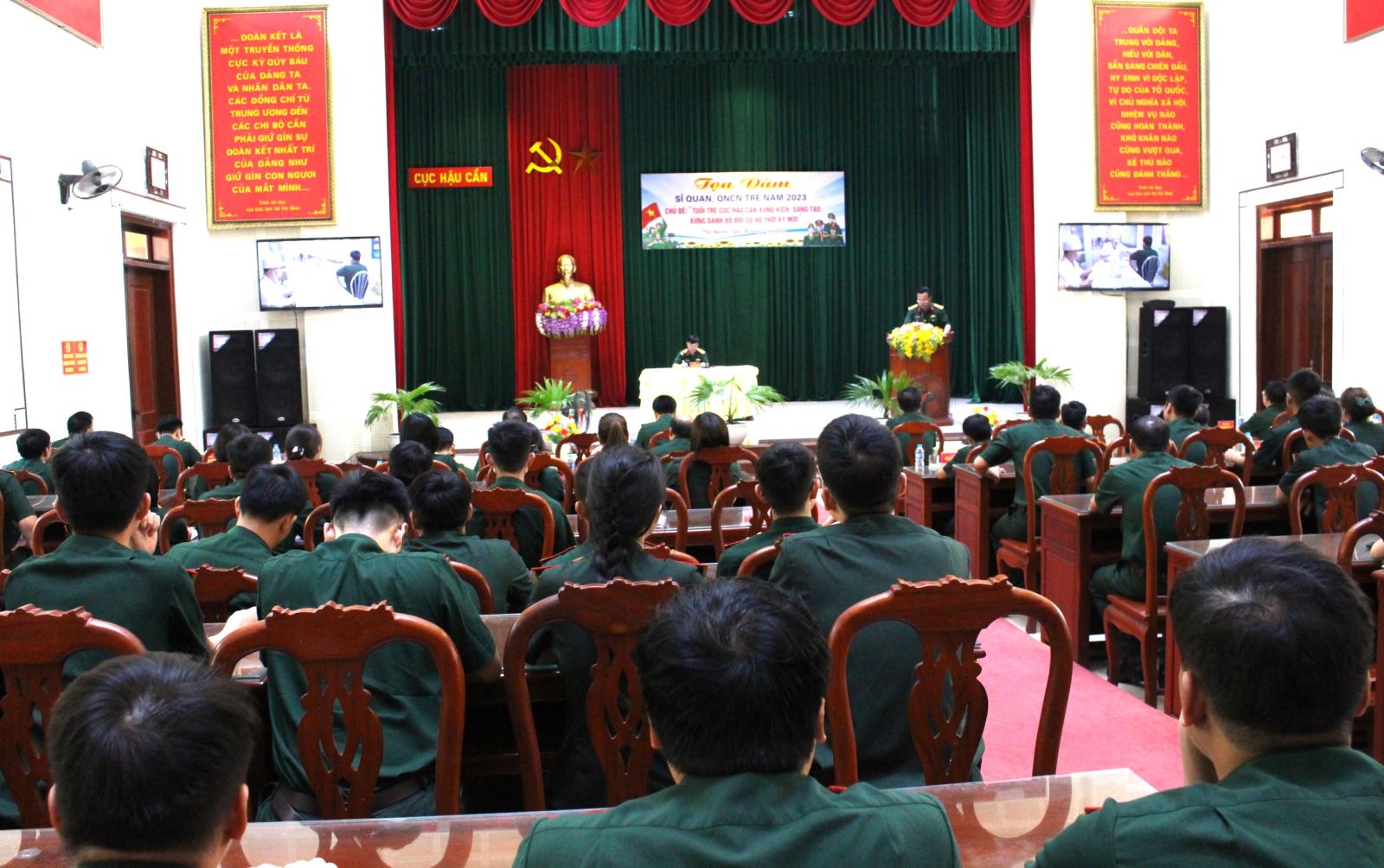 Chiều 26-7, Cục Hậu cần tổ chức toạ đàm sĩ quan, quân nhân chuyên nghiệp (QNCN) trẻ năm 2023 với chủ đề: Tuổi trẻ Cục Hậu cần xung kích, sáng tạo, xứng danh bộ đội Cụ Hồ thời kỳ mới. Đại tá Ngô Hồng Thái, Phó Chủ nhiệm Chính trị Quân khu dự và chỉ đạo; tham gia toạ đàm còn có thủ trưởng Cục Hậu cần và hơn 70 sĩ quan, QNCN trẻ.