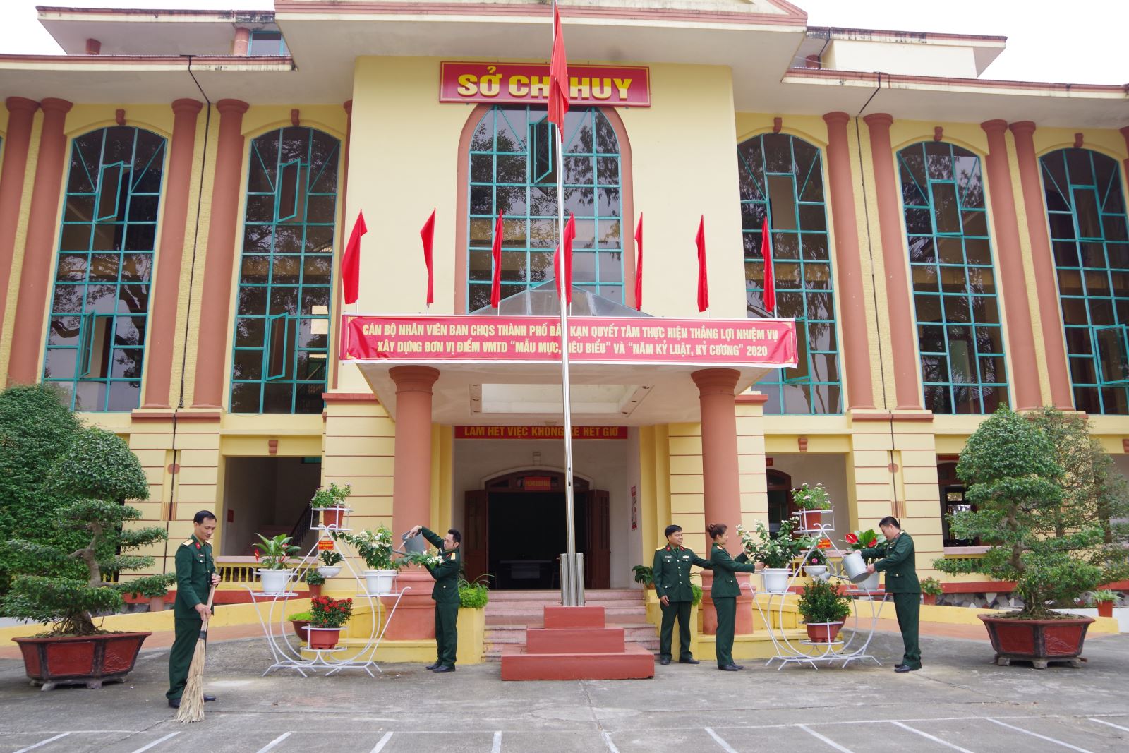 Cán bộ, nhân viên Ban CHQS thành phố Bắc Kạn củng cố khuôn viên đơn vị.