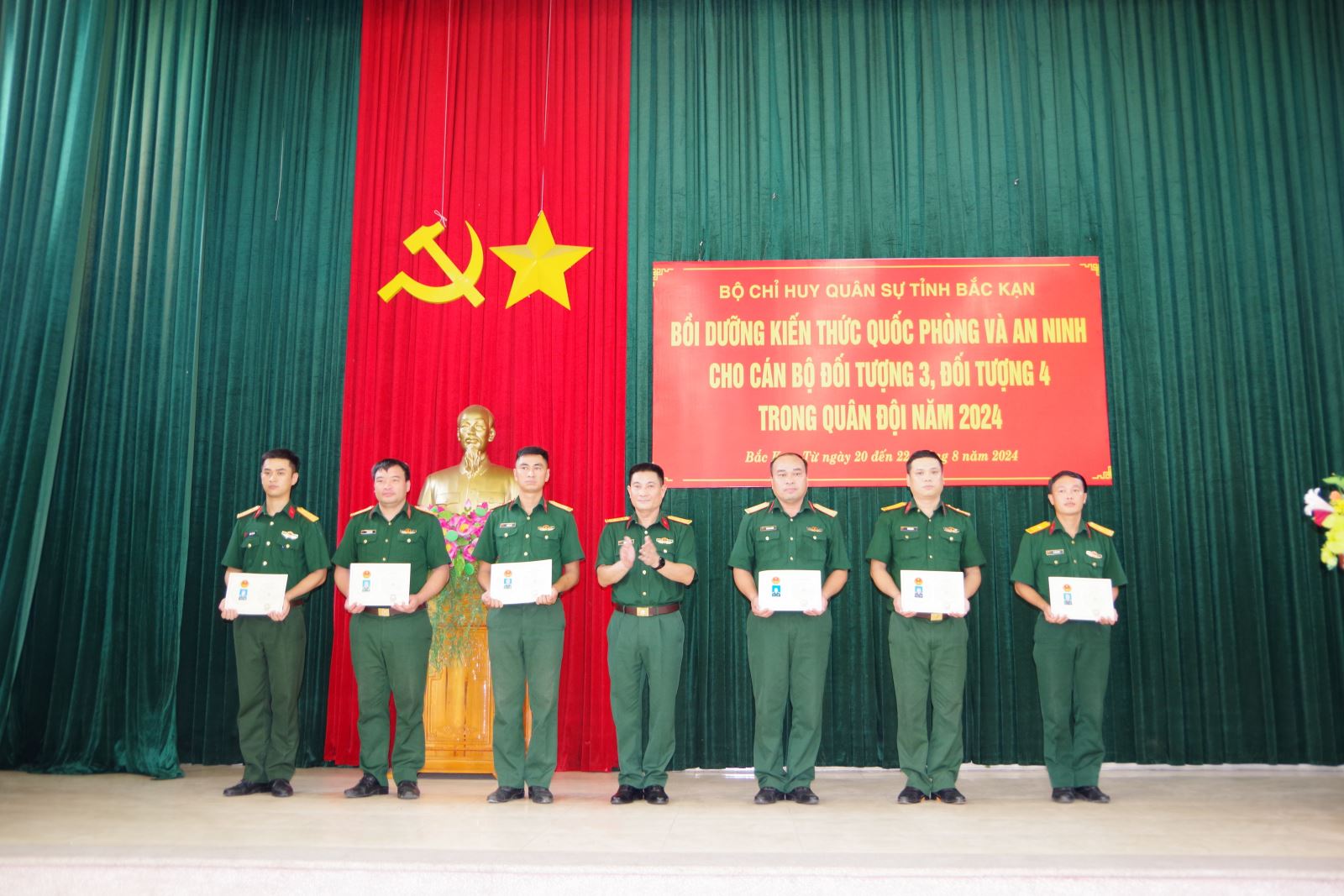 Đại tá Ngô Tuấn Anh, Phó chỉ huy trưởng, Tham mưu trưởng Bộ CHQS tỉnh Bắc Kạn trao giấy chứng nhận cho học viên hoàn thành lớp bồi dưỡng kiến thức QPAN.