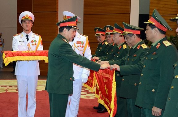 Thượng tướng Phan Văn Giang trao Cờ thi đua của Bộ Quốc phòng tặng các tập thể hoàn thành xuất sắc nhiệm vụ năm 2019.