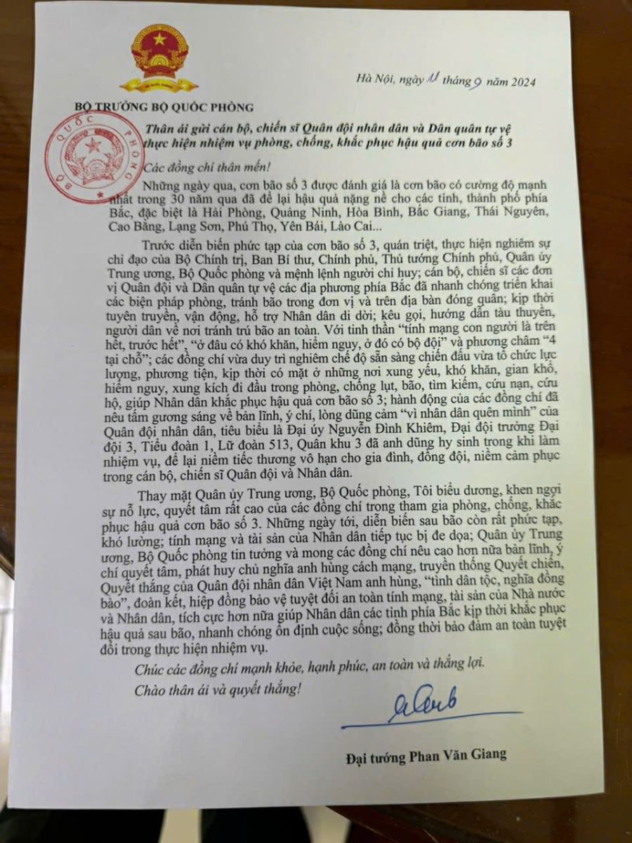 Bộ trưởng Bộ Quốc phòng gửi thư khen ngợi lực lượng tham gia phòng, chống khắc phục hậu quả thiên tai