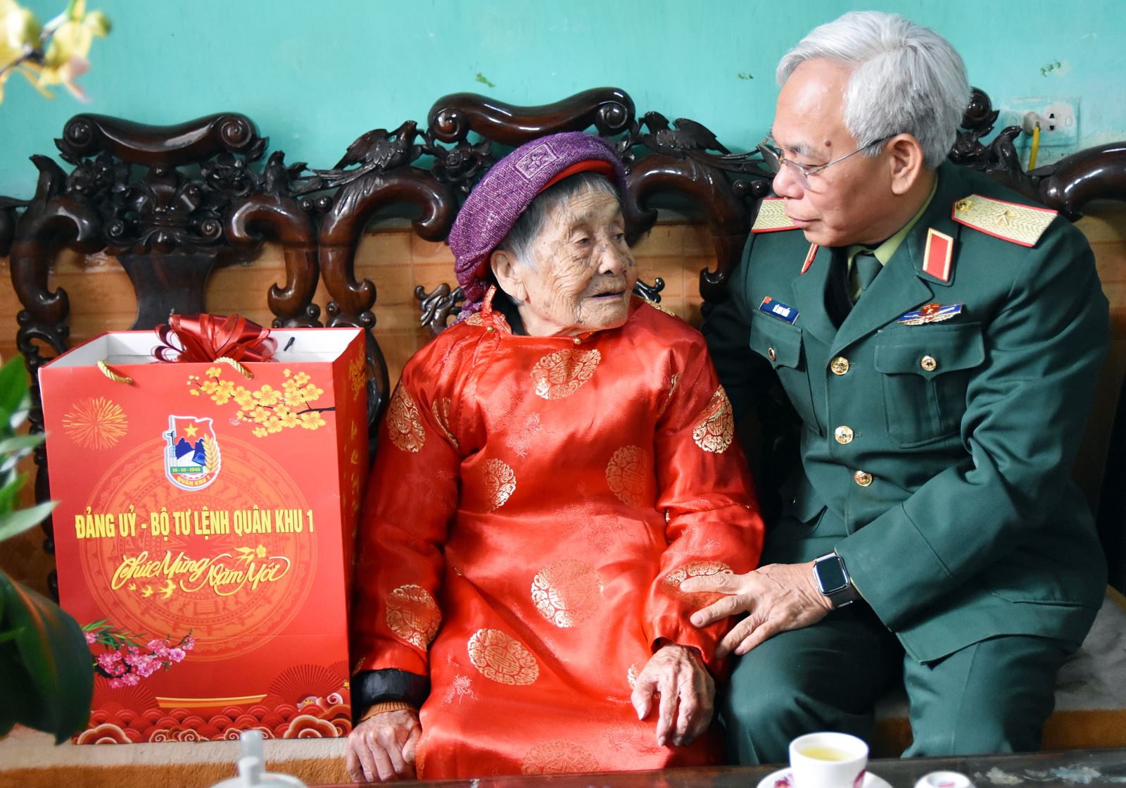 Thiếu tướng Lê Anh Tuấn, Phó tư lệnh Quân khu chúc tết Mẹ Việt Nam Anh hùng Nguyễn Thị Ngần (ở phường Vũ Ninh, thành phố Bắc Ninh).