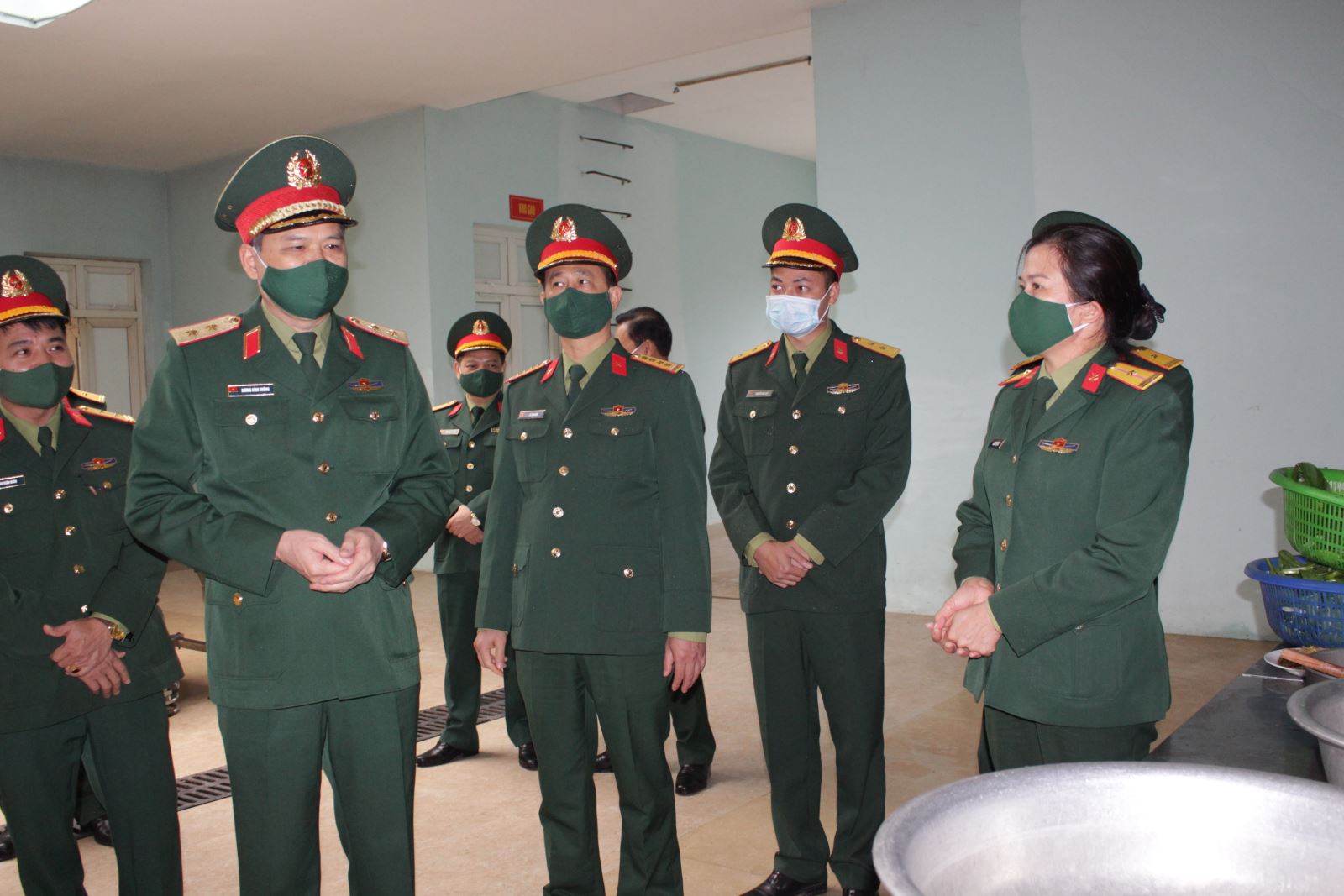 Trung tướng Dương Đình Thông, Bí thư Đảng ủy, Chính ủy Quân khu kiểm tra bếp nấu ăn phục vụ cán bộ, chiến sĩ và nhân dân đang thực hiện cách ly y tế của Tiểu đoàn 1, Trung đoàn 123, Bộ CHQS tỉnh Lạng Sơn.