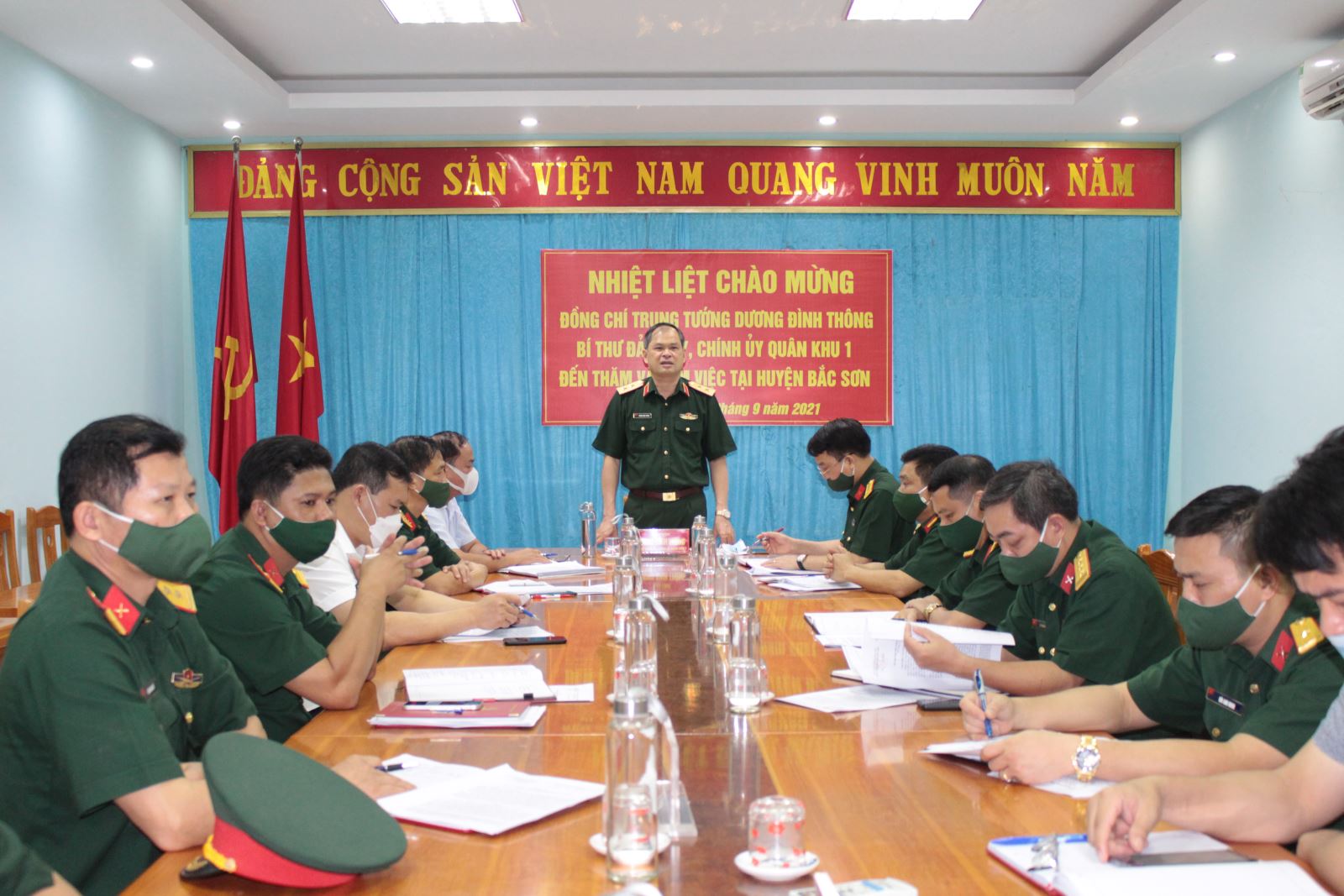 Thăm và làm việc tại Ban CHQS huyện Bắc Sơn, sau khi nghe lãnh đạo huyện Bắc Sơn báo cáo tình hình phát triển kinh tế, văn hóa, xã hội, quốc phòng - an ninh của địa phương, Trung tướng Dương Đình Thông, Bí thư Đảng ủy, Chính ủy Quân khu chúc mừng những thành tựu mà cấp ủy, chính quyền nhân dân huyện Bắc Sơn đã đạt được trong thời gian qua.
