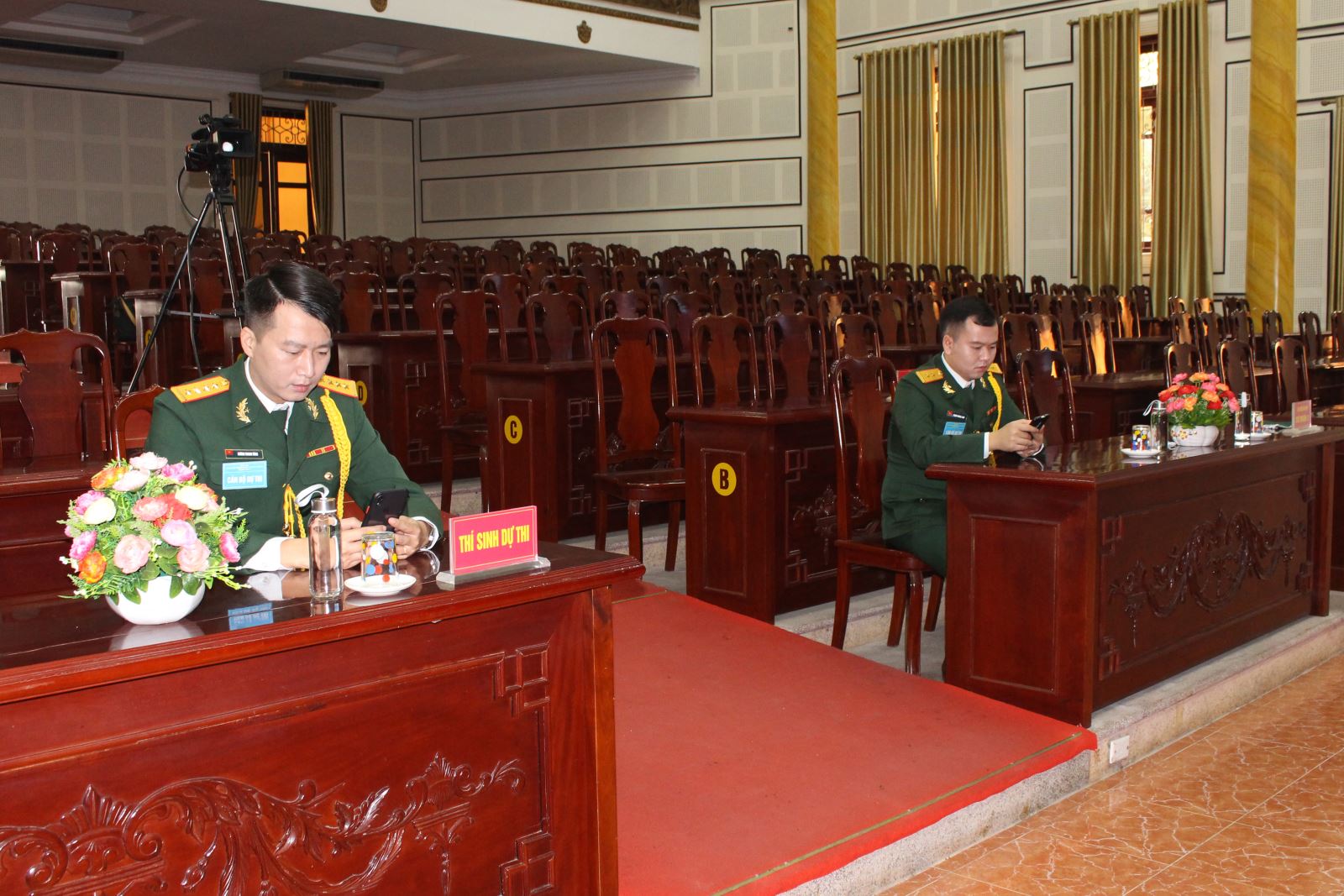 Đại úy Dương Thanh Tùng, Sư đoàn 346 và Trung úy Phạm Hoàng Anh, Sư đoàn 3 tham gia phần thi nhận thức bằng phần mềm mocha trên điện thoại tại điểm cầu Quân khu 1. Ảnh: QUỐC HẢ