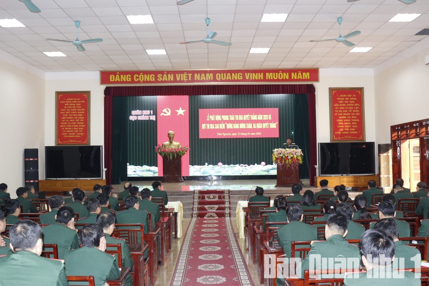 Sáng 13-1, Cục Chính trị tổ chức quán triệt, triển khai thực hiện Nghị quyết, Chỉ thị và phát động Phong trào thi đua Quyết thắng năm 2026; đợt thi đua cao điểm “Mừng Đảng, mừng Xuân, ra quân Quyết thắng”. Thiếu tướng Ngô Hồng Thái, Bí thư Đảng ủy Cục Chính trị, Phó Chủ nhiệm Chính trị Quân khu chủ trì hội nghị.