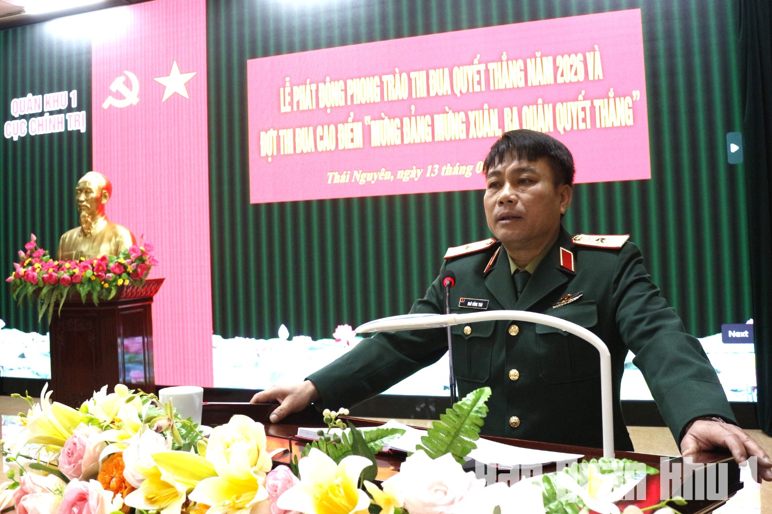 Thiếu tướng Ngô Hồng Thái, Bí thư Đảng ủy Cục Chính trị, Phó chủ nhiệm Chính trị Quân khu phát động phong trào thi đua.