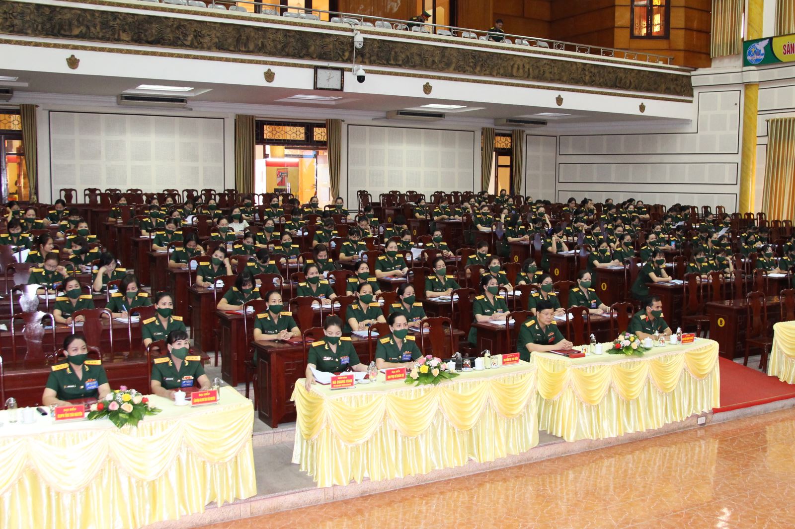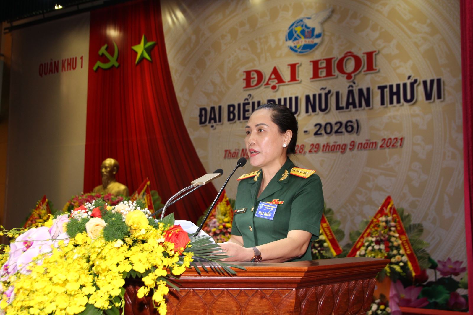 Thiếu tá QNCN Dương Thị Cúc, Chủ tịch Hội phụ nữ cơ quan Văn phòng Bộ tư lệnh Quân khu, thay mặt Đoàn chủ tịch báo cáo tổng hợp ý kiến tham gia của Đại hội phụ nữ cơ sở vào các văn kiện trình Đại hội đại biểu phụ nữ toàn quốc lần thứ XIII và hướng dẫn thảo luận.