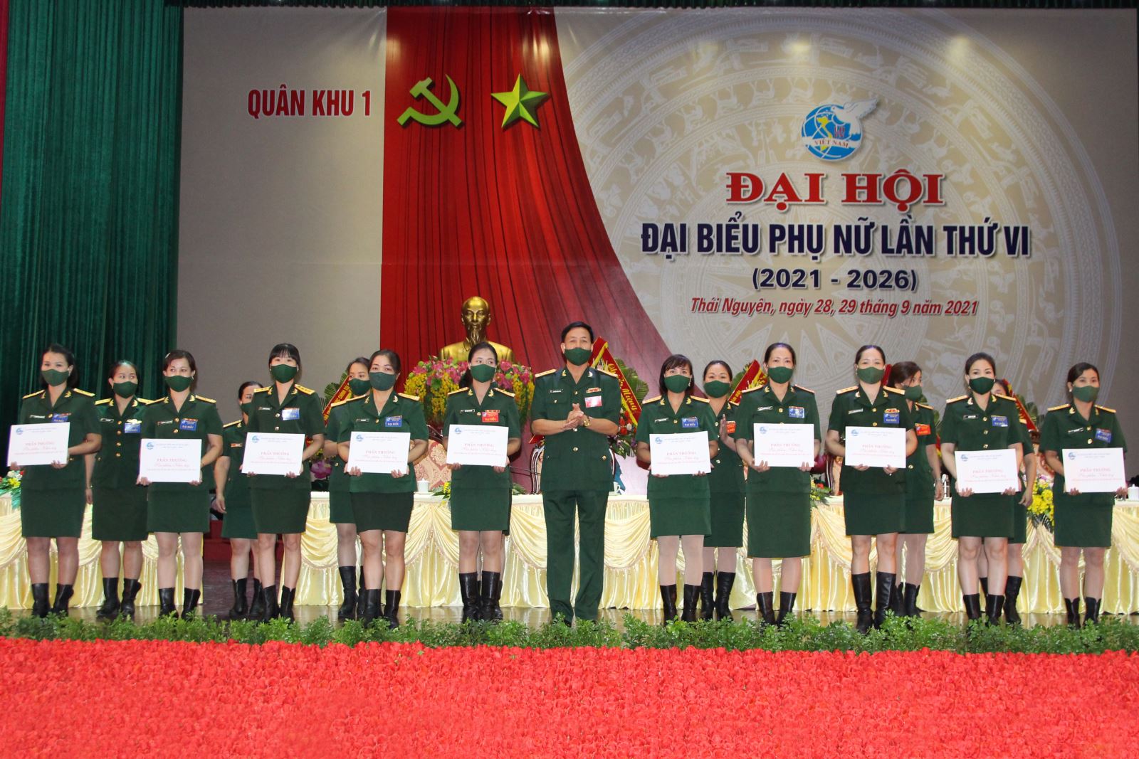 Thiếu tướng Nguyễn Đình Chiêu, Phó chính ủy Quân khu, Trưởng Ban vì sự tiến bộ phụ nữ Quân khu trao thưởng cho các tác giả xuất sắc tham gia trưng bày tác phẩm ảnh chào mừng Đại hội phụ nữ.