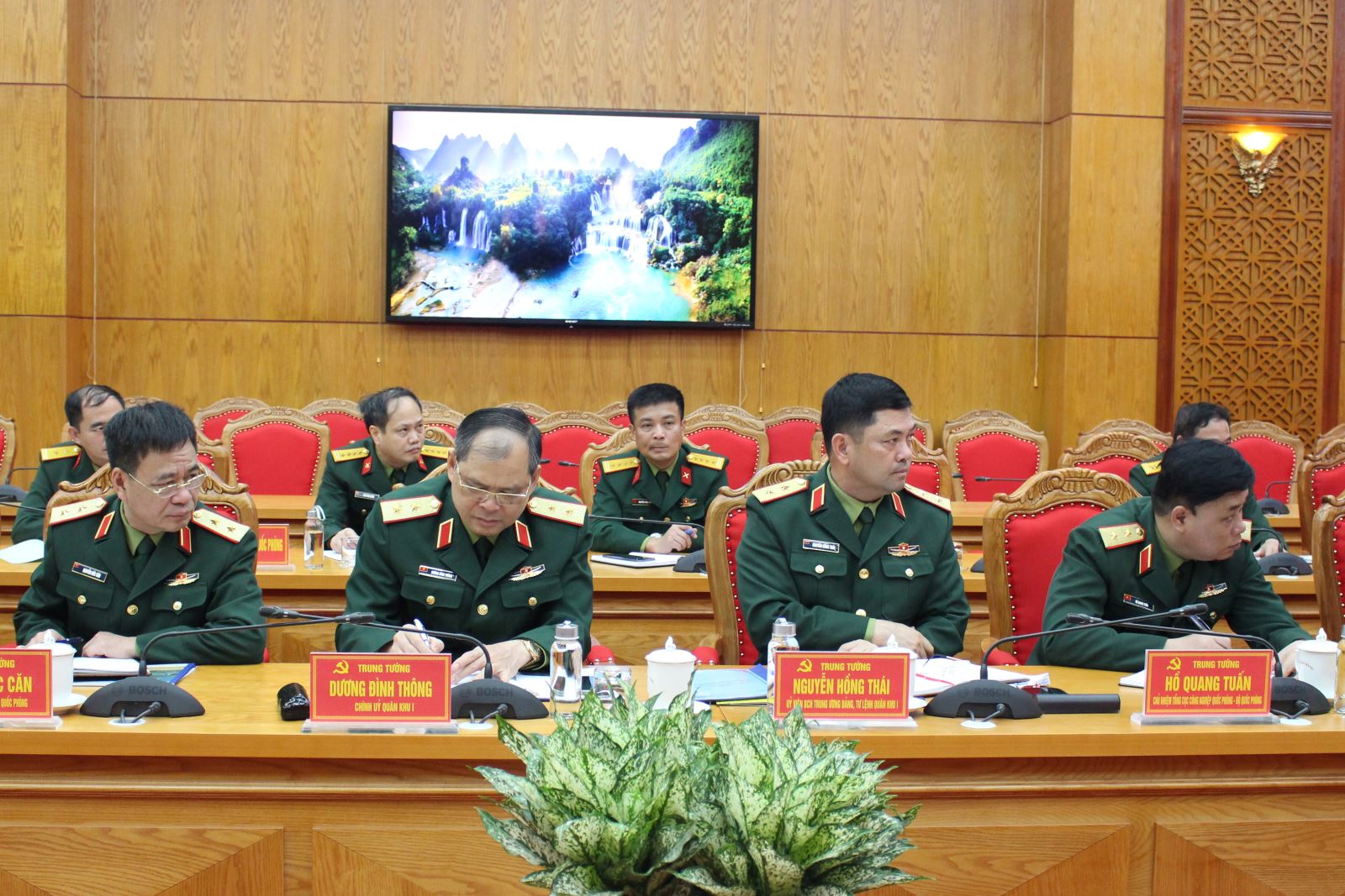 Trung tướng Nguyễn Hồng Thái, Ủy viên Trung ương Đảng, Tư lệnh Quân khu; Trung tướng Dương Đình Thông, Bí thư Đảng ủy, Chính ủy Quân khu và các đại biểu dự buổi làm việc.