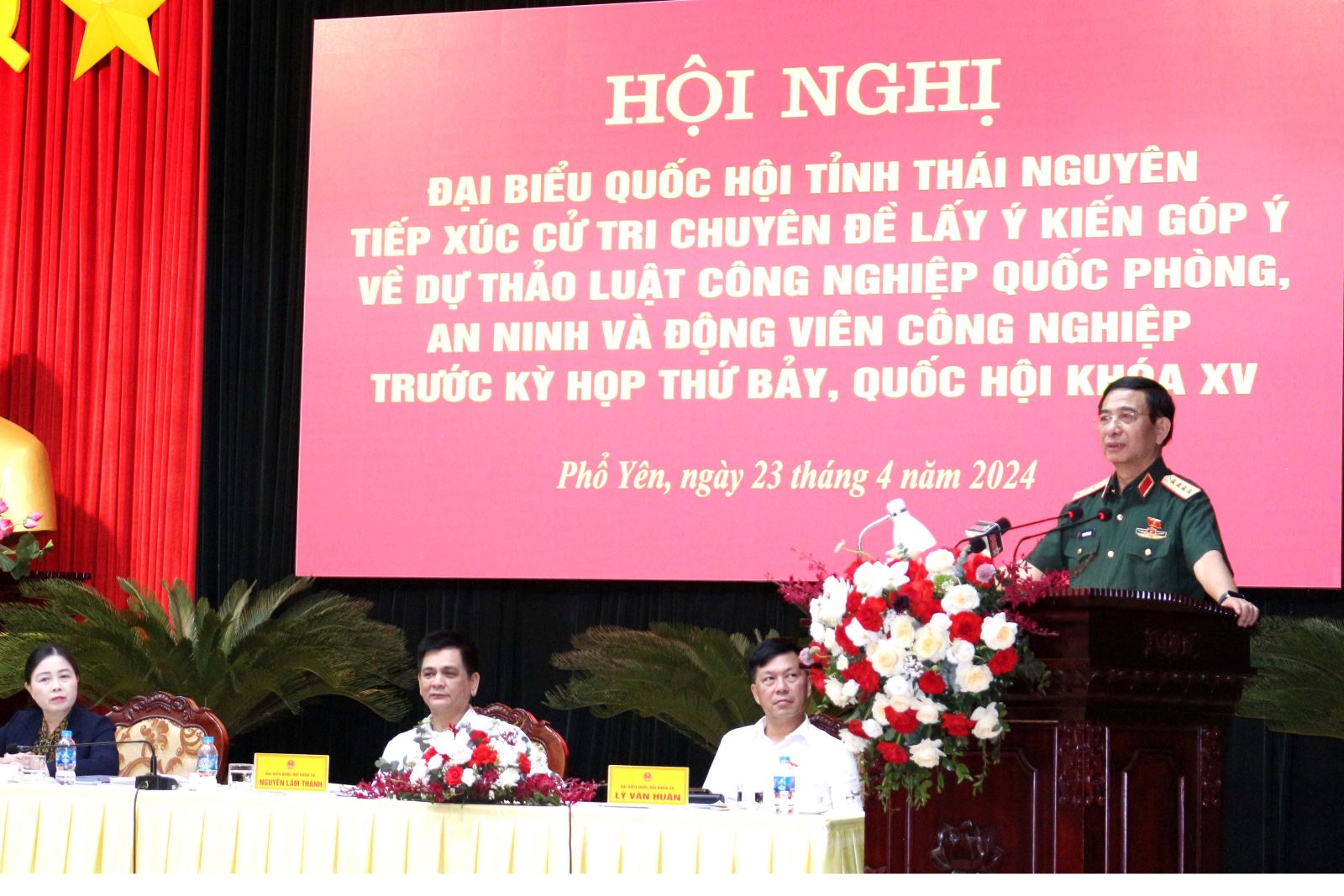 Chiều 23-4, Đại tướng Phan Văn Giang, Ủy viên Bộ Chính trị, Phó bí thư Quân ủy Trung ương, Bộ trưởng Bộ Quốc phòng cùng các đồng chí thuộc đoàn đại biểu Quốc hội tỉnh Thái Nguyên đã tiếp xúc cử tri chuyên đề lấy ý kiến vào dự thảo Luật Công nghiệp quốc phòng, an ninh và động viên công nghiệp trên địa bàn tỉnh Thái Nguyên trước Kỳ họp thứ bảy, Quốc hội khóa XV.