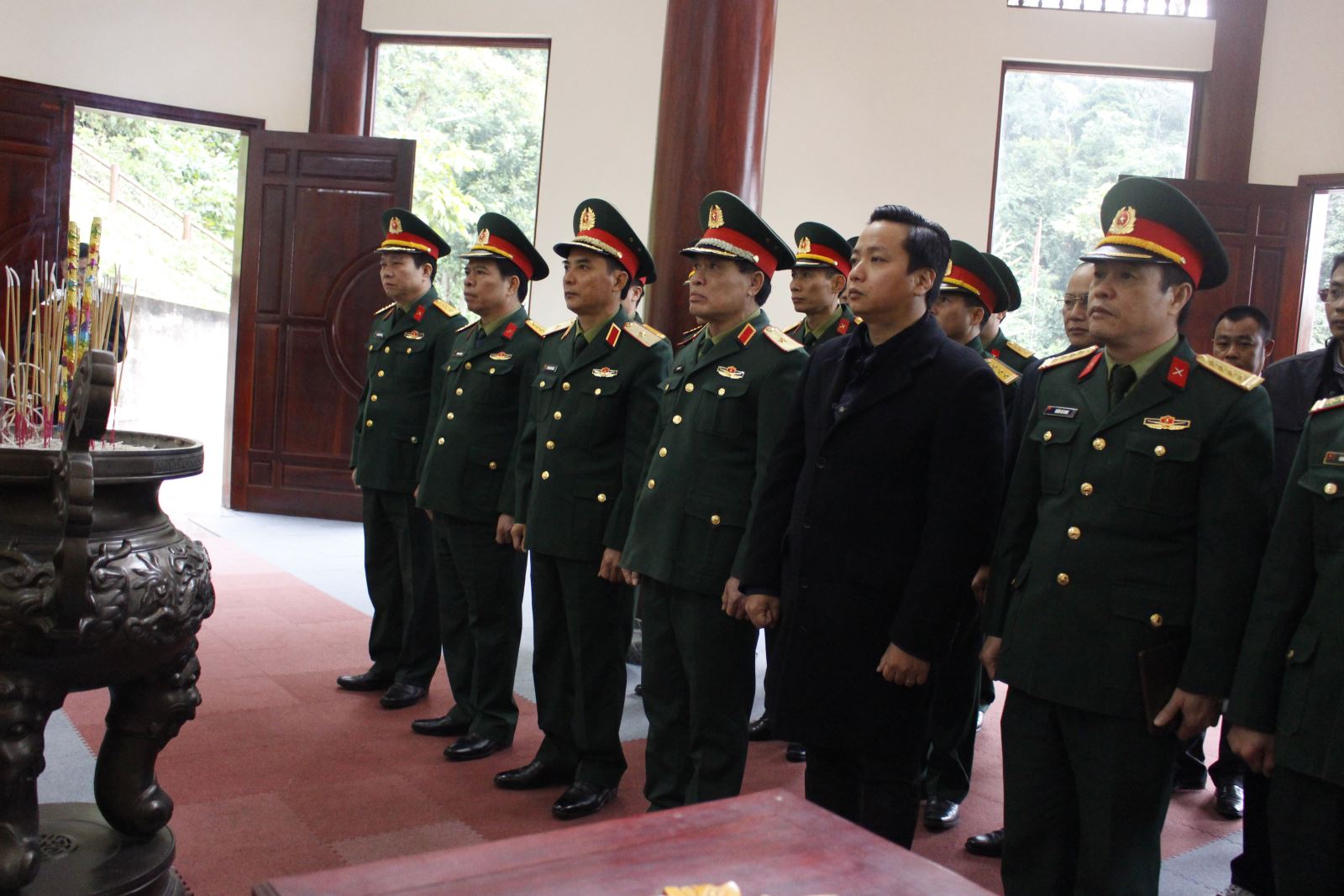 Thừa ủy quyền của Quân ủy Trung ương, Bộ Quốc phòng, Thiếu tướng Trần Văn Kình, Phó tư lệnh Quân khu, Trưởng đoàn công tác và các thành viên trong đoàn dâng hương tưởng niệm Đại tướng Võ Nguyên Giáp tại Khu di tích Quốc gia đặc biệt Rừng Trần Hưng Đạo.