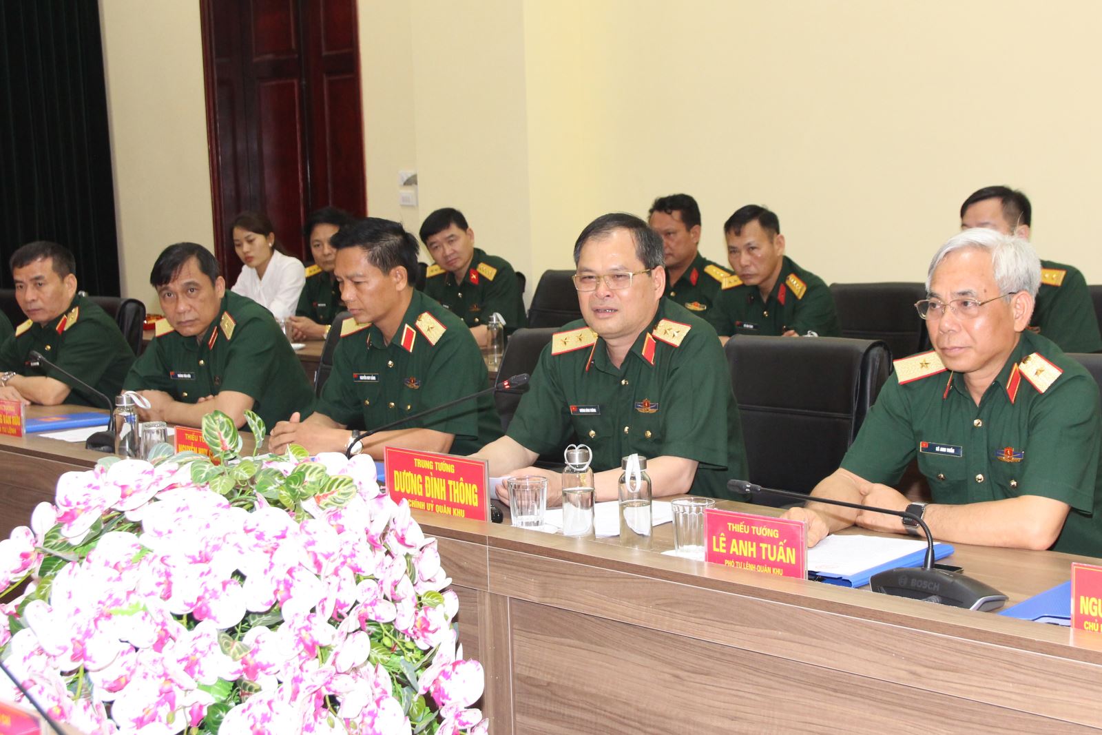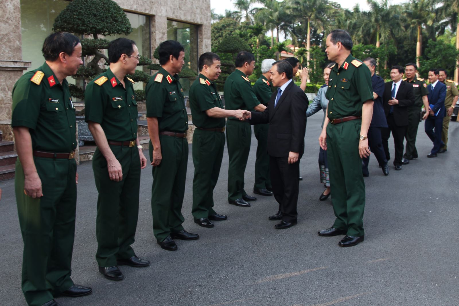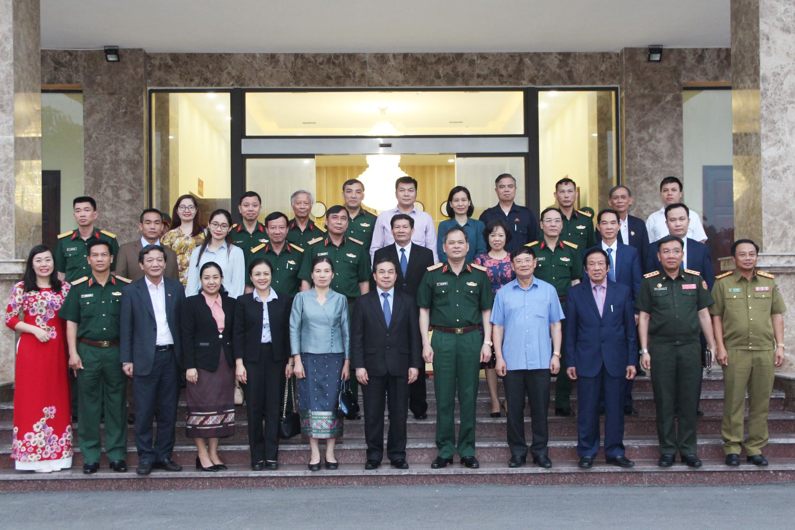 Các đồng chí trong Đảng ủy, Bộ tư lệnh, cơ quan Quân khu đón đoàn công tác Đại sứ quán Lào.