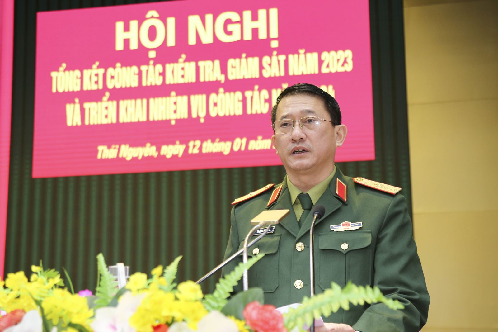Thiếu tướng La Công Phương, Phó Chính ủy Quân khu, Chủ nhiệm UBKT Đảng ủy Quân khu trình bày báo cáo trung tâm trước hội nghị.