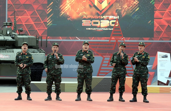 Các thành viên Đội tuyển xe tăng thể hiện bài hát "Năm anh em trên một chiếc xe tăng" tại lễ trao giải.