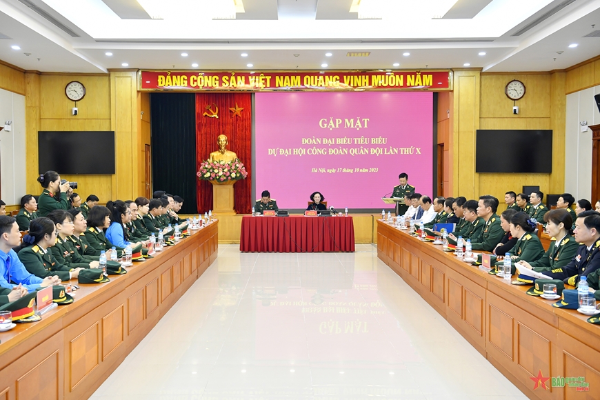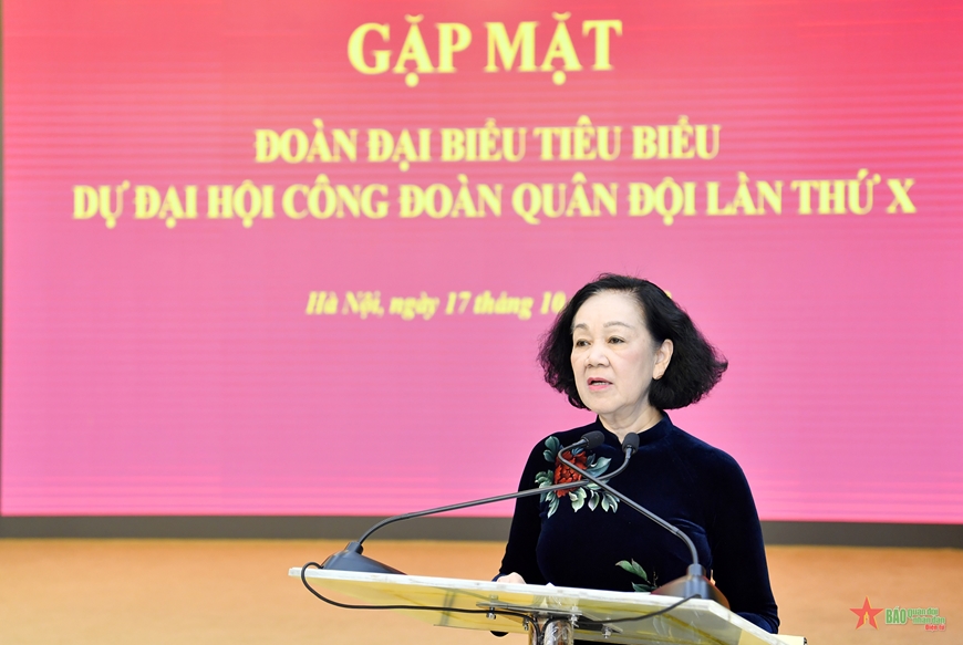 Sáng 17-10, tại trụ sở Trung ương Đảng, đồng chí Trương Thị Mai, Ủy viên Bộ Chính trị, Thường trực Ban bí thư, Trưởng ban Tổ chức Trung ương đã tiếp 85 đại biểu công đoàn tiêu biểu tham dự Đại hội đại biểu Công đoàn Quân đội lần thứ X (2023-2028). Dự buổi gặp mặt có Trung tướng Nguyễn Văn Gấu, Ủy viên Trung ương Đảng, Phó chủ nhiệm Tổng cục Chính trị Quân đội nhân dân Việt Nam.