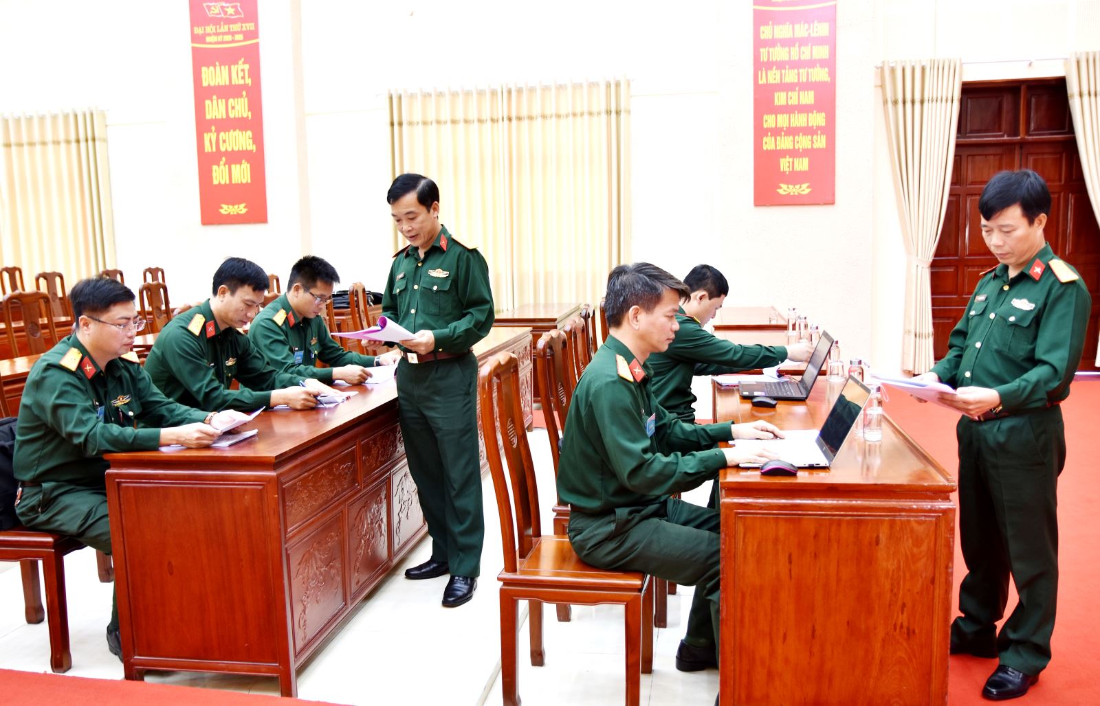 Lãnh đạo Bộ CHQS tỉnh Bắc Ninh kiểm tra việc chuẩn bị giáo án giảng bài chính trị của thí sinh.