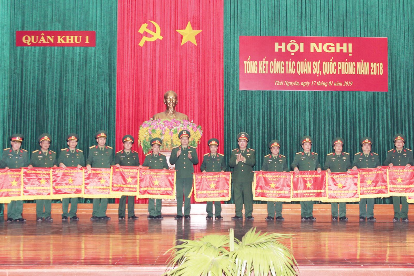 Thủ trưởng Bộ tư lệnh Quân khu tặng Cờ thi đua cho các đơn vị hoàn thành xuất sắc nhiệm vụ năm 2018. Ảnh: MẠNH NGUYÊN